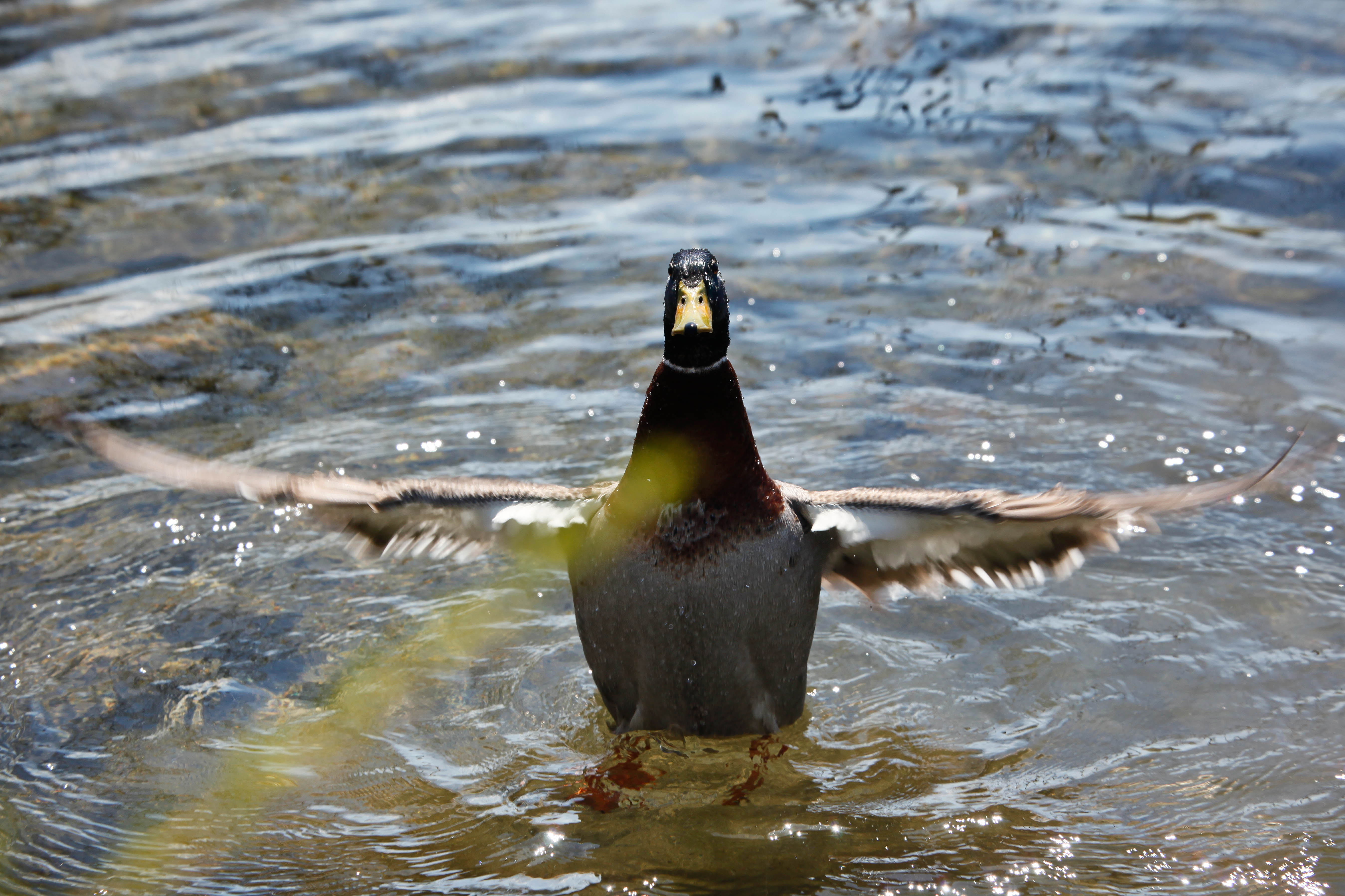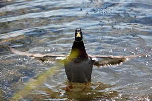 The photograph captures a mallard duck standing proudly in a shimmering pool of water, its wings outstretched in a dramatic pose. The sunlight reflects off the surface, enhancing the vibrant colors of the duck and creating a lively, radiant mood. The gentle ripples around the bird amplify a sense of tranquility and movement, making it a serene yet captivating moment in nature.