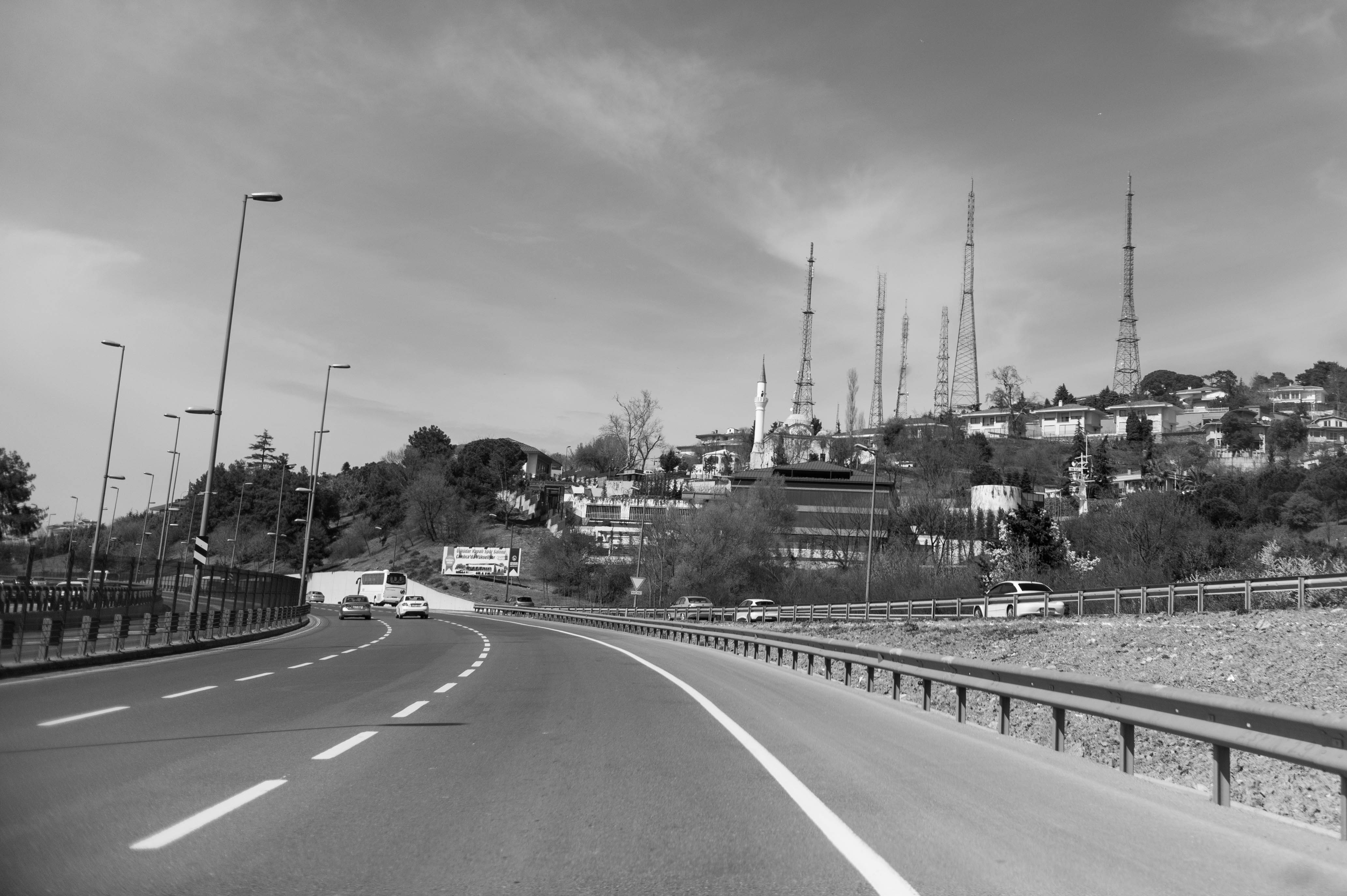 A winding road cuts through a monochromatic landscape, leading the eye toward a hill dotted with towering radio masts and a mosque. The stark lighting enhances the contrast between the urban structures and the natural surroundings, evoking a sense of journey and contemplation. The overall mood is tranquil yet dynamic, capturing a moment between modernity and tradition in an expansive cityscape.