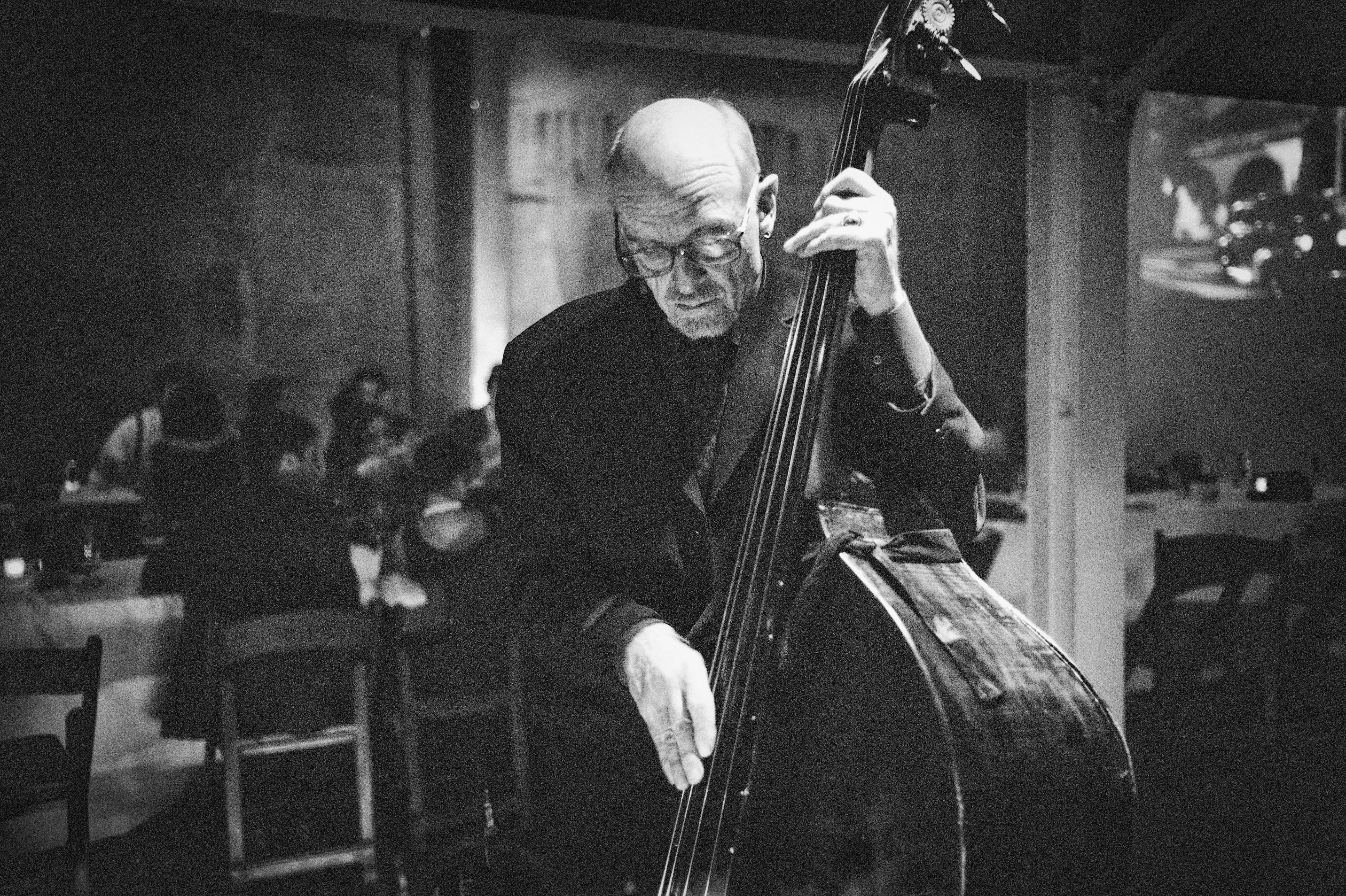 The photograph captures a moment of intense concentration as an elderly man plays a double bass, his brows furrowed in deep focus. The dim lighting casts soft shadows, enhancing the intimate atmosphere of the gathering, while the blurred silhouettes in the background suggest an engaged audience. Subtle tones of black and white evoke a classic, timeless quality, echoing the soulful music reverberating through the room.