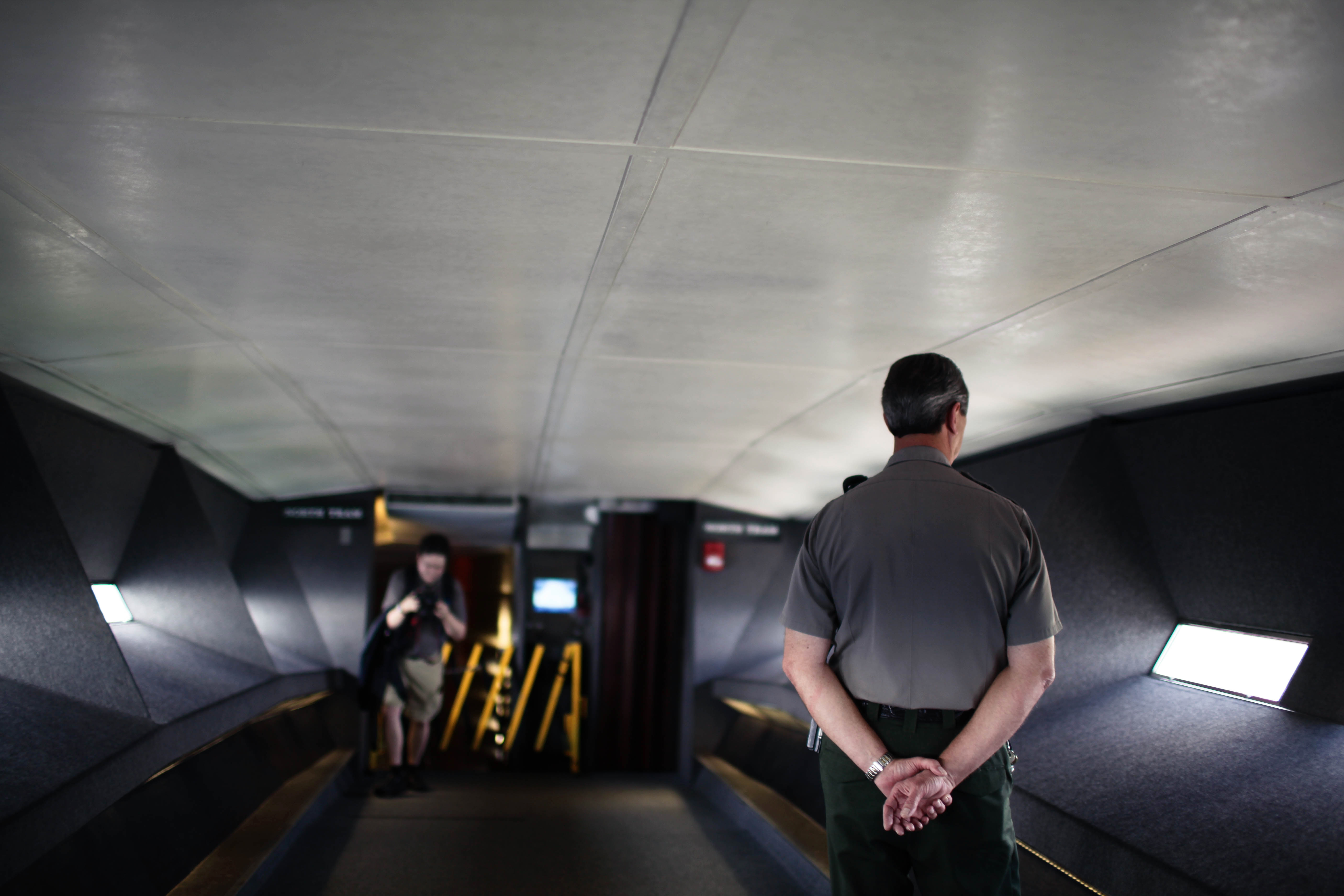 This photograph captures a contemplative moment in a sleek, tunnel-like environment, illuminated by soft, focused lighting. A security guard stands with hands clasped behind his back, exuding an air of vigilance and authority, while a visitor explores nearby, creating a subtle tension between duty and curiosity. The geometric lines of the space enhance the mood of contemplation and mystery, drawing viewers into the depths of this intriguing setting.