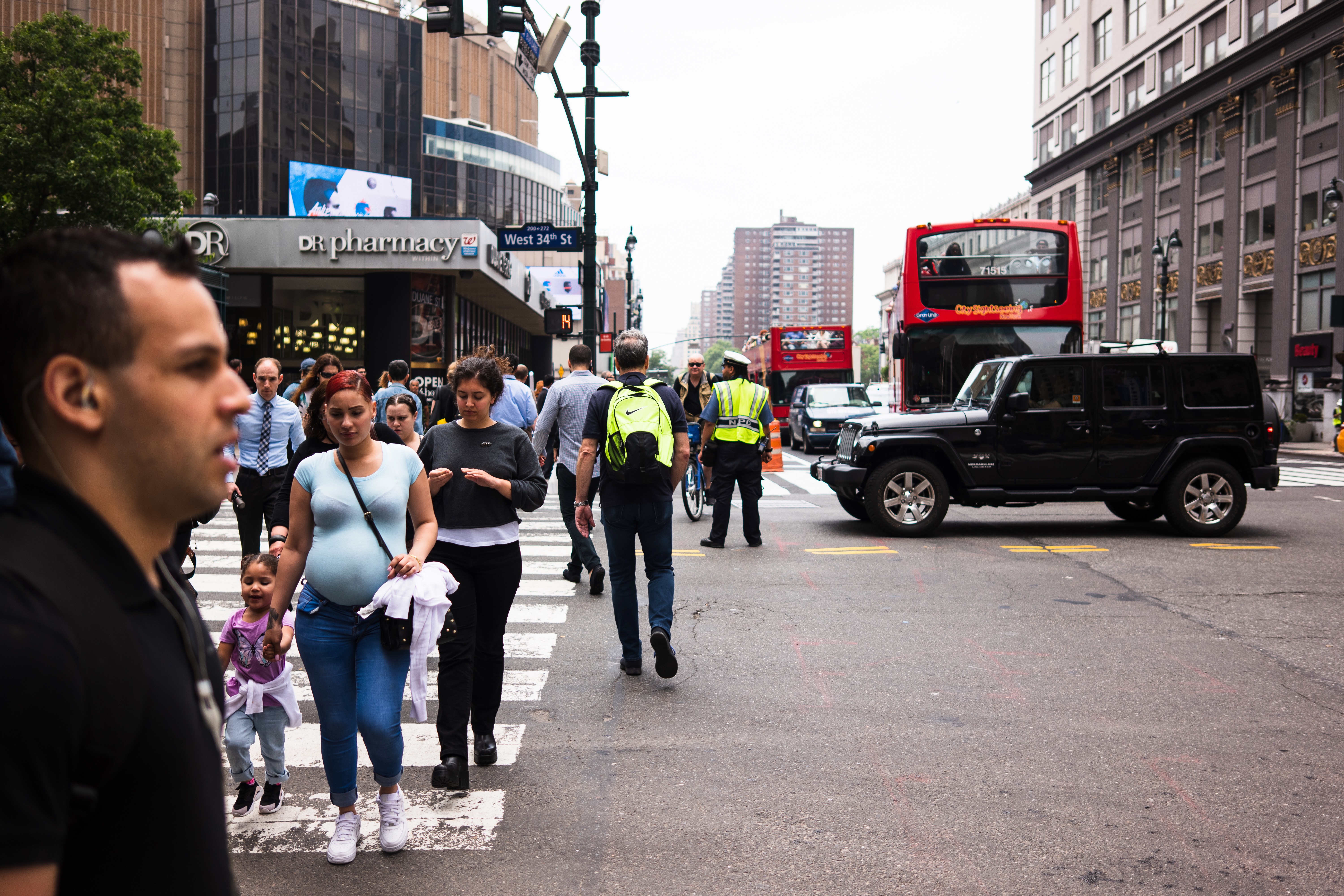 In a bustling city scene, pedestrians navigate a crosswalk, embodying the rhythm of urban life. The soft, overcast lighting casts a muted palette over the streets, enhancing the sense of movement and engagement among the diverse crowd. Vehicles remain momentarily still, creating a contrast between their static presence and the dynamic flow of people, emphasizing the interplay between man and city.