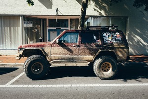 A muddy off-road vehicle sits parked by a storefront, exuding a sense of adventure and resilience. Sunlight casts soft shadows, highlighting the dirt-encrusted details and stickers, suggesting recent excursions beyond the city's boundaries. The juxtaposition of the rugged car against a clean, urban backdrop enhances its character and story.