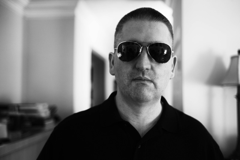 A man stands stoically, clad in a black polo and sunglasses, exuding an air of mystery. The high-contrast black and white composition emphasizes his serious demeanor against a softly blurred background, creating an intimate yet unsettling atmosphere. Natural light pours in from the side, casting subtle shadows that enhance the tension of the moment.