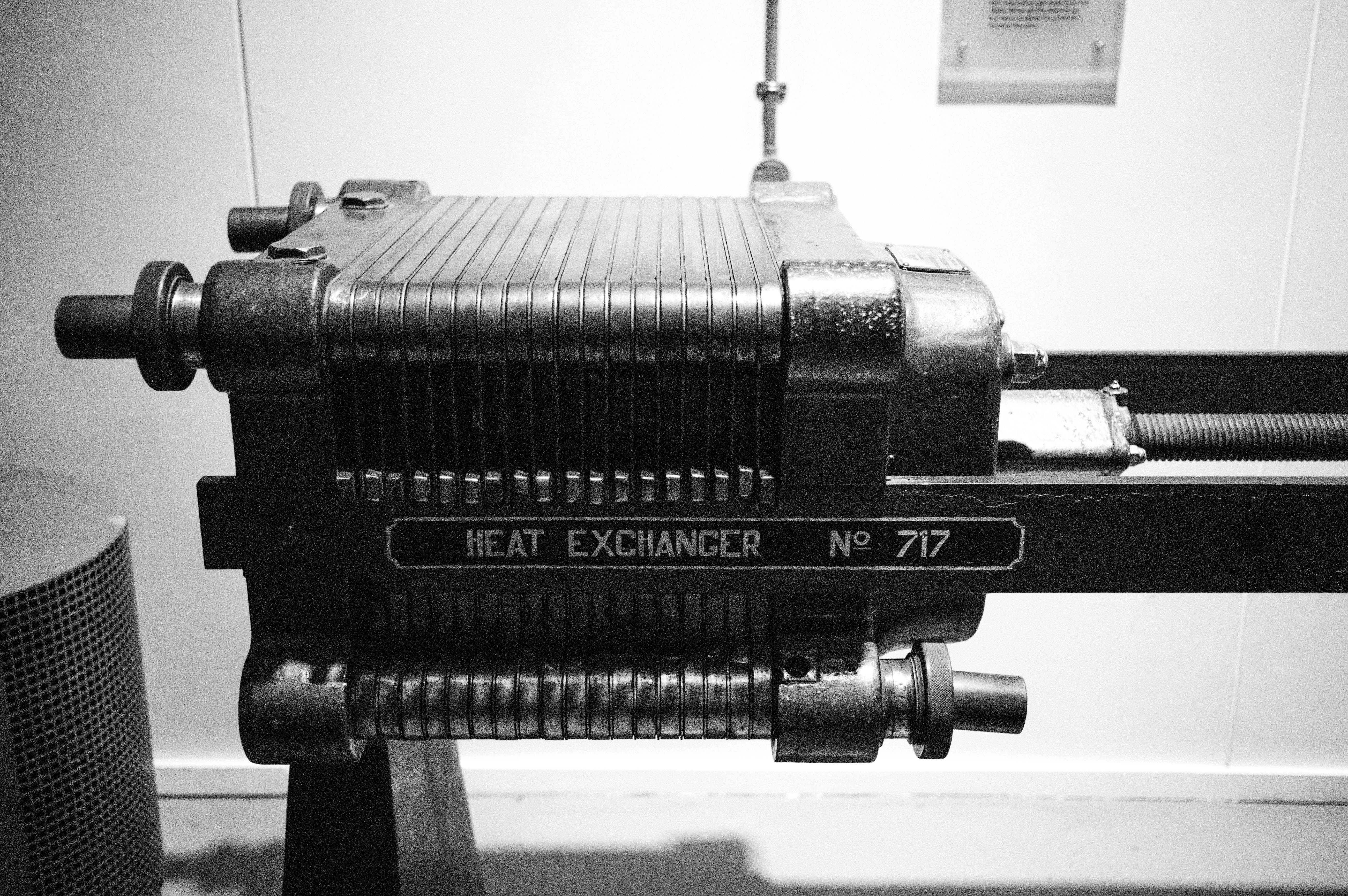The photograph captures a close-up of a vintage heat exchanger, displaying its intricate design and sturdy metallic form. The black-and-white palette enhances the industrial mood, casting deep shadows that highlight the object's textured surfaces. The composition balances the mechanical elements with negative space, inviting contemplation of engineering history.