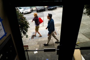 Framed by an open doorway, two figures traverse a city sidewalk, their contrasting styles and motions creating a dynamic tableau. The subdued lighting hints at an overcast day, while the reflections on the glass add depth to the scene. A feeling of quiet contemplation pervades as the outside world unfolds with muted tones and a casual rhythm.