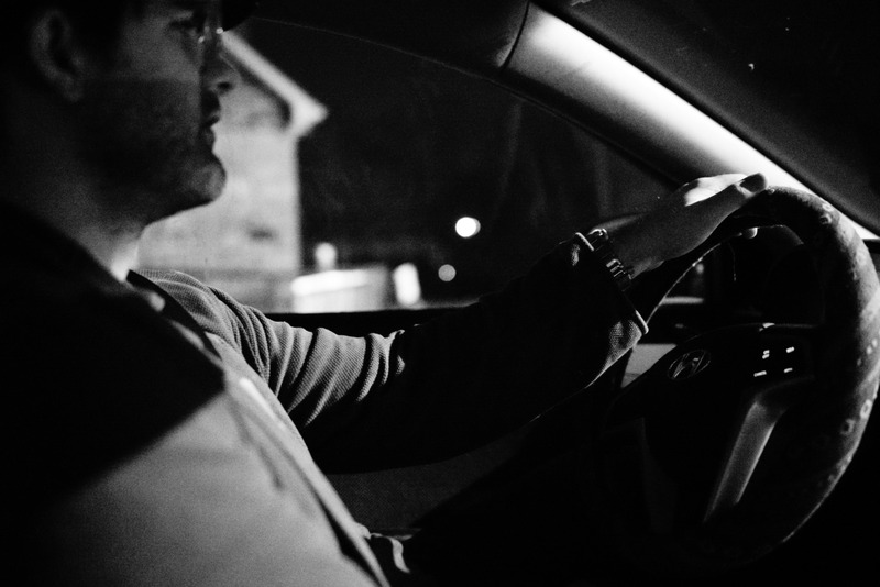 The photograph captures a solitary figure in a car, deep in thought under the cover of night. The dramatic black-and-white contrast emphasizes the contours of his face and the softness of the interior, creating a contemplative mood. Subtle shadows and a blurred background hint at an evening journey filled with introspection and quiet anticipation.