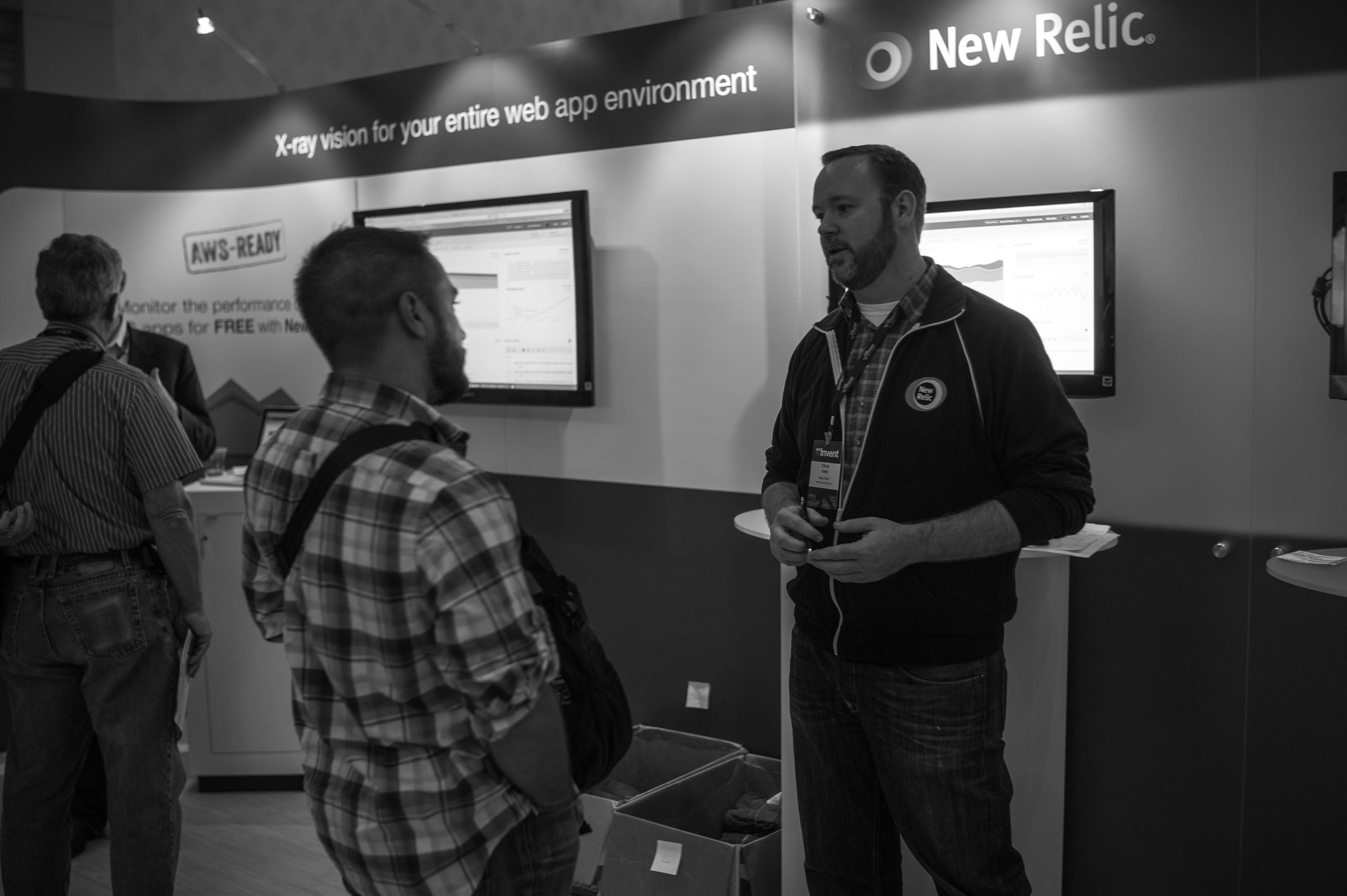 In this monochromatic scene, two men engage in an animated discussion at a tech conference booth. The soft, ambient lighting highlights their focused expressions, while the backdrop, adorned with digital screens, creates a professional yet inviting atmosphere.