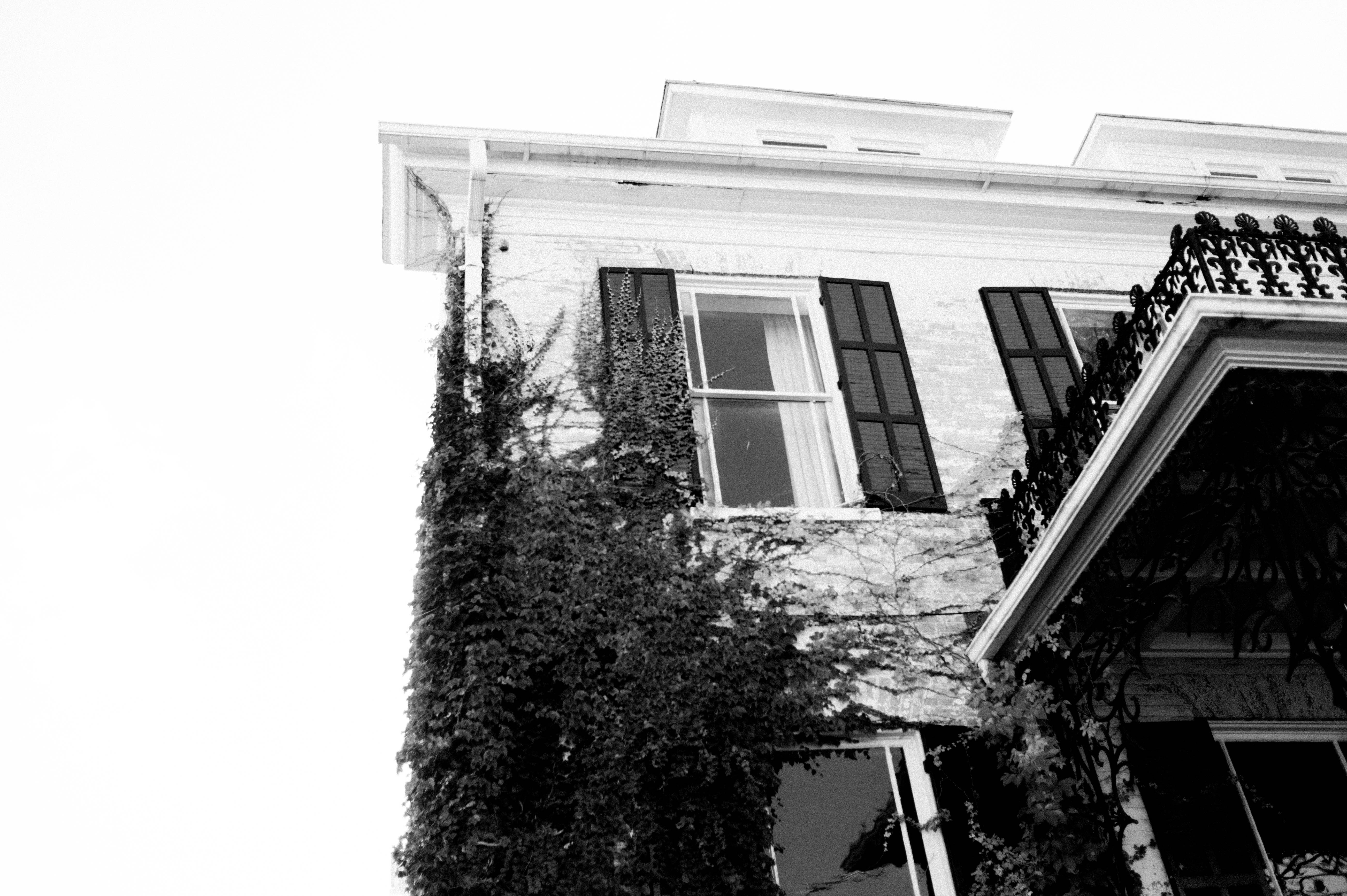 The photograph captures the aged façade of a historic house, adorned with ivy creeping up its whitewashed walls, evoking a sense of nostalgia. Soft, diffused light enhances the mood, casting gentle shadows that emphasize the intricate details of the wrought iron balcony and window frames. The monochrome palette deepens the sense of time standing still, inviting the viewer to ponder the stories hidden within its walls.