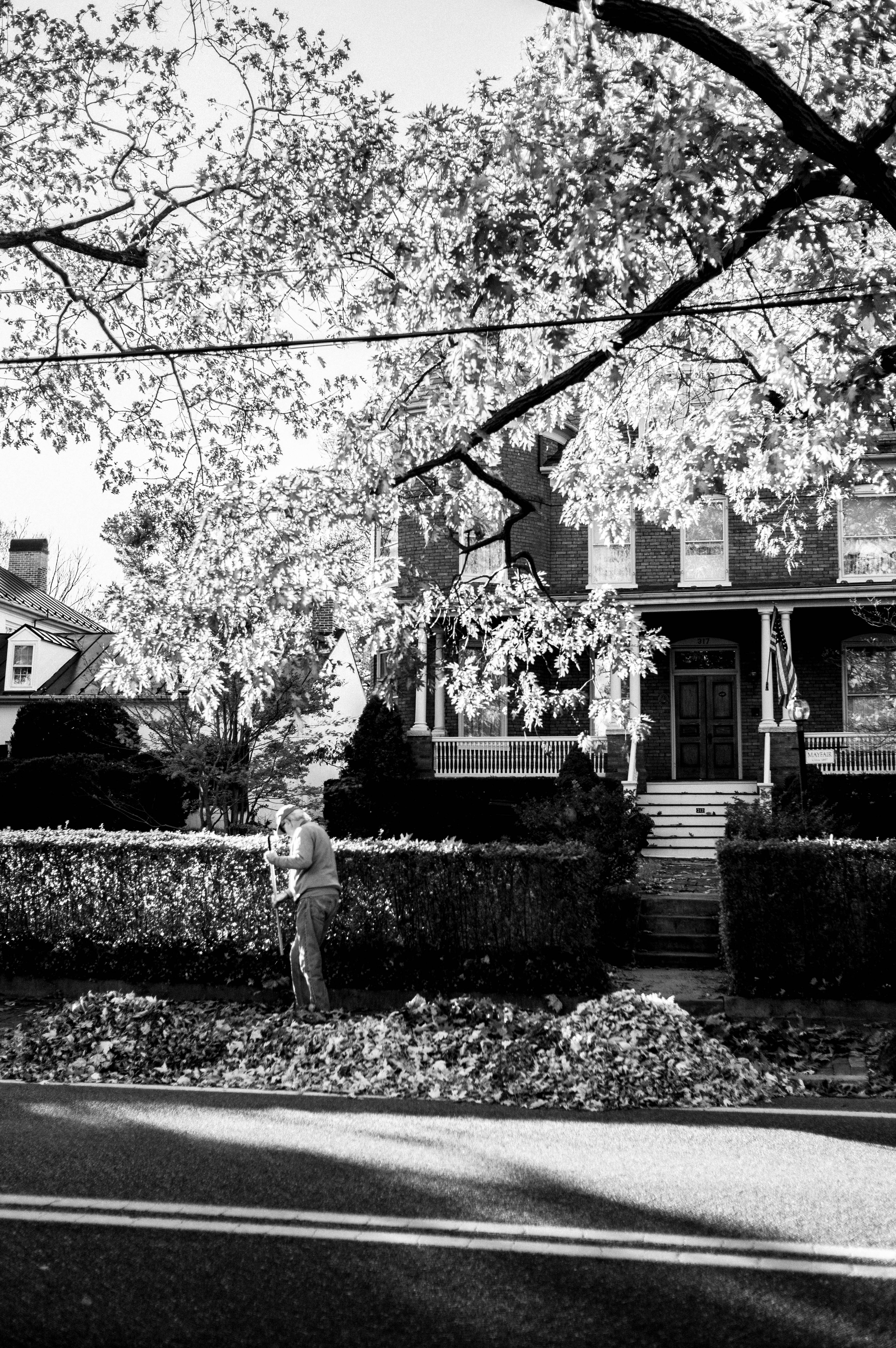 In a serene black-and-white scene, a man busily rakes leaves amidst the backdrop of a charming brick house. The mood is reflective, evoking a sense of nostalgia and the quiet beauty of autumn chores. The interplay of light captures the crispness of the day, with dappled shadows enhancing the peaceful domesticity of the moment.