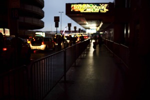 This photograph captures a dimly lit street scene with blurred outlines of waiting taxis and pedestrians, creating a sense of anticipation. The overhead sign, glowing with vibrant colors against the twilight, contrasts with the soft shadows enveloping the surroundings. The mood leans towards a quiet but bustling evening, hinting at movement and life despite the subdued lighting.