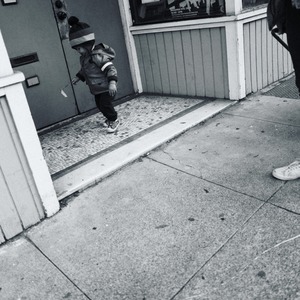 A little child, clad in a cozy jacket and a colorful hat, takes tentative steps outside a door, the scene largely captured in black and white. The low-angle composition directs attention to the child's exploratory spirit, while the subtle textures of the sidewalk and the façade contribute to an intimate, nostalgic atmosphere. Soft lighting highlights the child's focused expression, evoking a sense of innocence and wonder in everyday life.