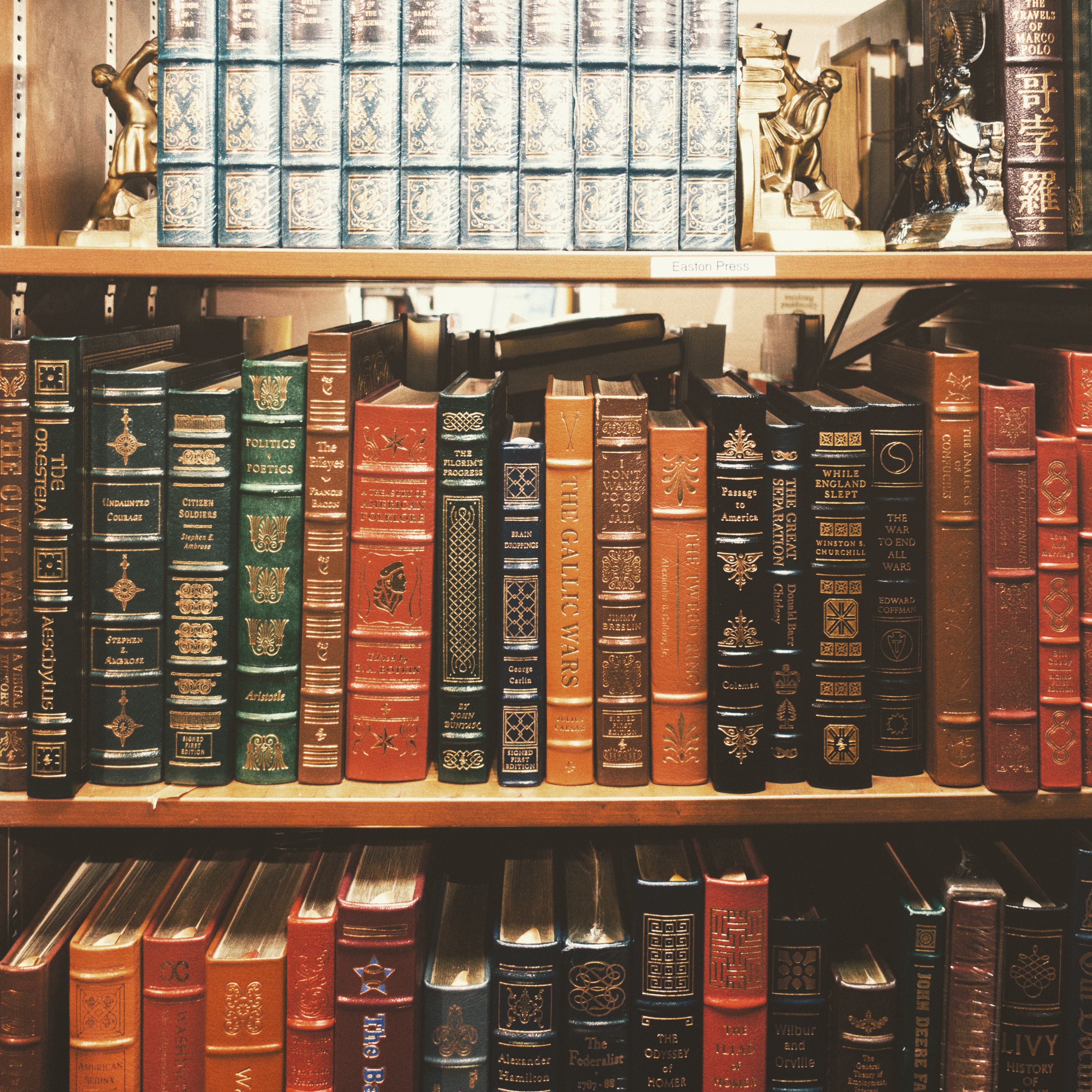 This photograph captures an array of meticulously bound books lined on wooden shelves, showcasing a rich tapestry of colors and textures. The warm tones and soft lighting create an inviting atmosphere, evoking a sense of nostalgia and intellectual curiosity. Each spine tells a story, inviting the viewer to explore the knowledge contained within.