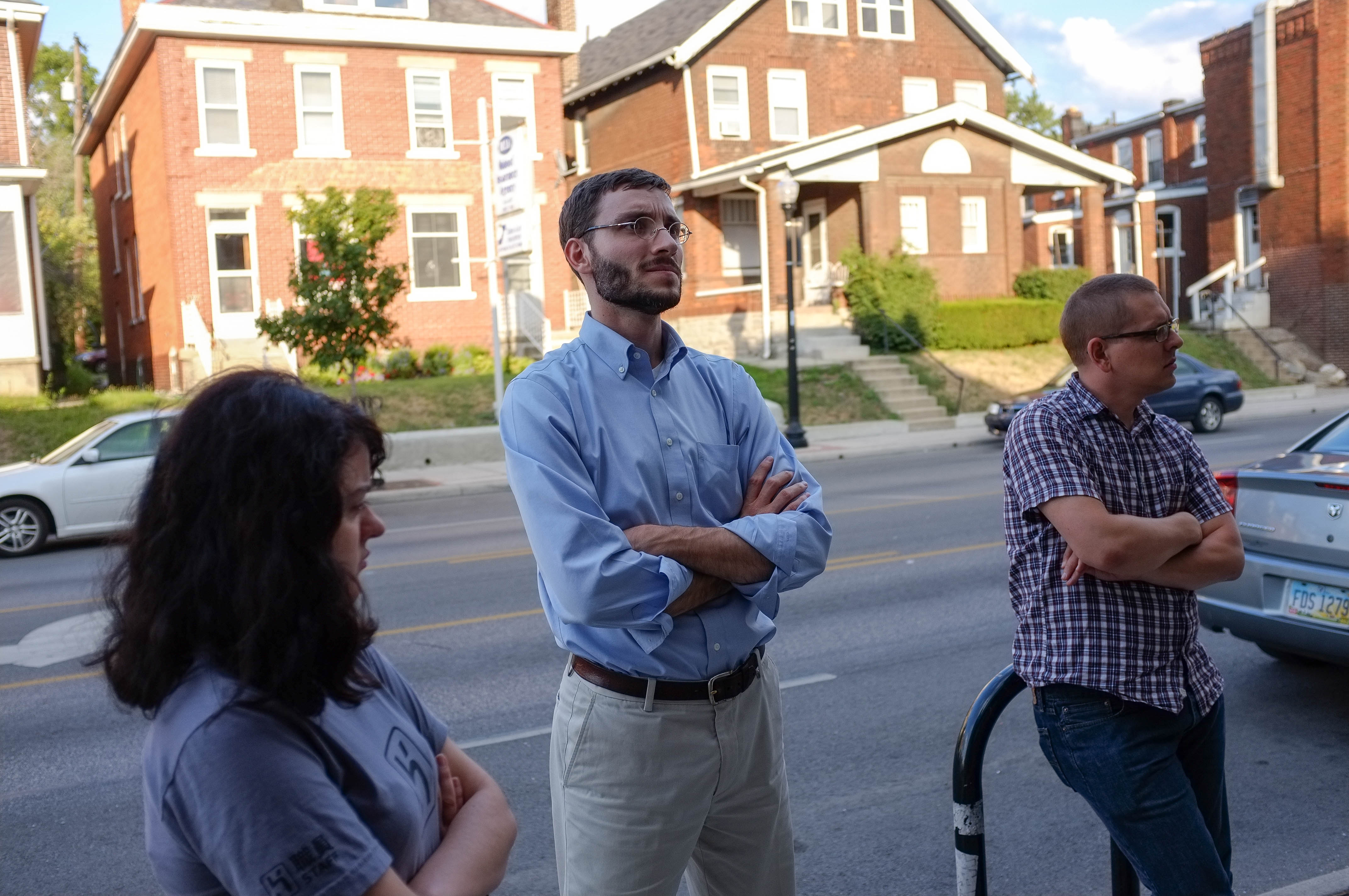 Three individuals stand together on a city street, their expressions reflective and somewhat serious. The warm light of the afternoon sun casts gentle shadows, enhancing the mood of contemplation among the brick buildings in the background. Each person's posture and gaze suggest a moment of pause, inviting speculation about their thoughts and the context of their gathering.