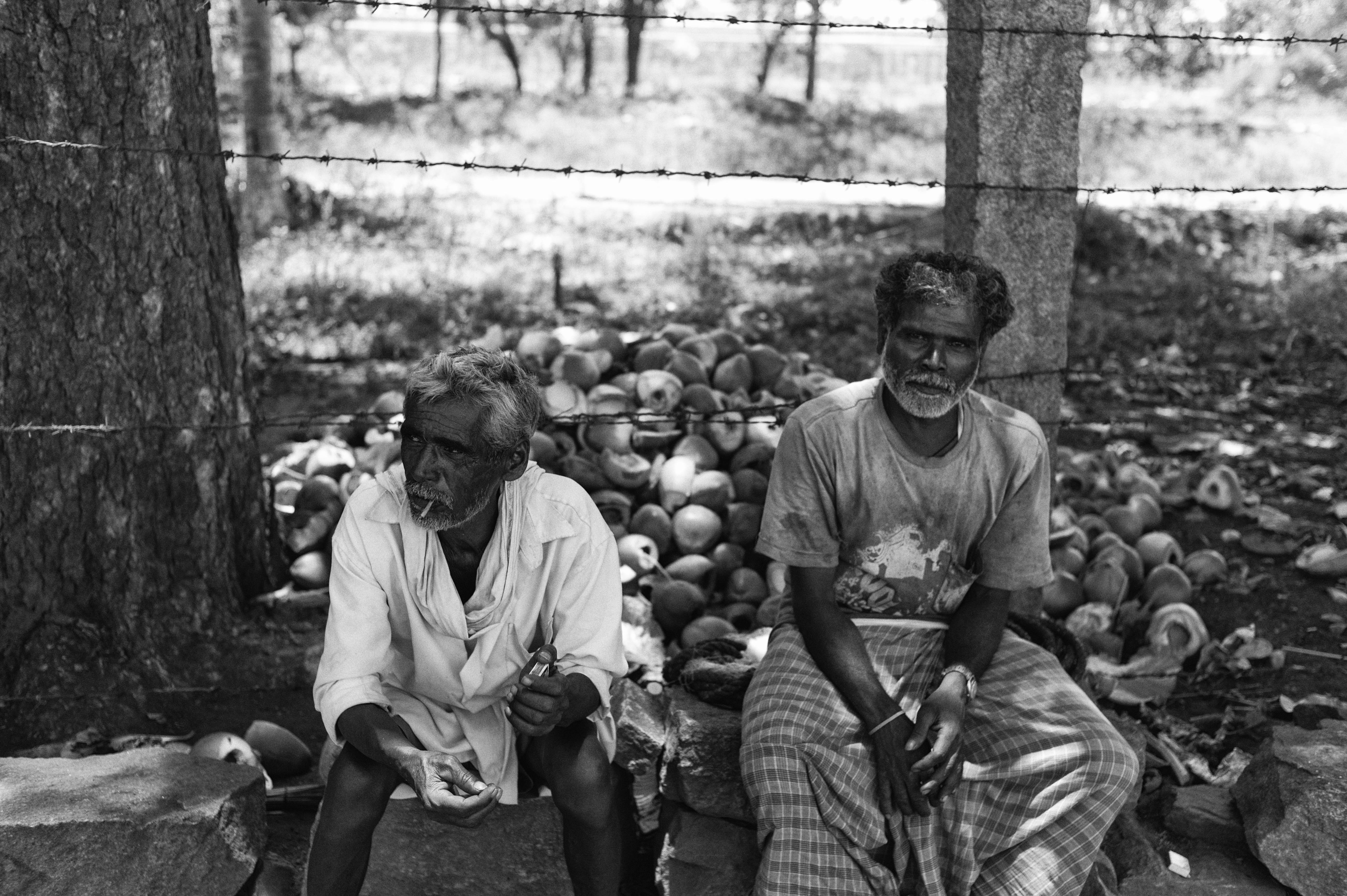 Two elderly men sit against a backdrop of scattered coconuts, their expressions reflecting a world of experience and resilience. The black-and-white composition emphasizes their weathered features, while the dappled sunlight filtering through the trees enhances the somber yet contemplative mood. Barbed wire in the foreground subtly suggests barriers, contrasting with the men’s relaxed posture in this intimate moment of quiet camaraderie.