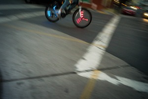 A cyclist speeds through an intersection, illuminated by vibrant blue and pink lights on the wheels, creating a striking contrast against the muted city backdrop. The motion blur suggests a sense of urgency and energy, while the fading daylight casts a warm glow around the scene. The composition draws the eye to the dynamic movement, capturing the pulse of an urban evening.