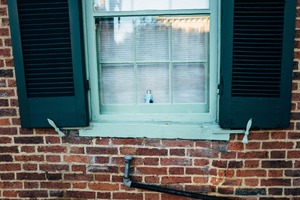 This photograph captures a green-framed window nestled within a rustic brick wall, creating a sense of nostalgia. A small figurine is visible behind the sheer curtains, adding an element of intrigue and whimsy. The warm, natural light gently illuminates the scene, contrasting with the cool green tones and dark shutters, evoking a serene yet enigmatic mood.