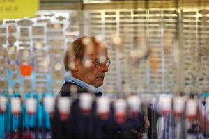 In a vibrant market setting, an elderly man appears introspective as he stands behind a display of colorful goods. The soft focus on the foreground creates a sense of depth, contrasting with the sharp detail of the man's concentrated expression. Warm lighting enhances the ambiance, evoking a serene mood amid the bustling surroundings.