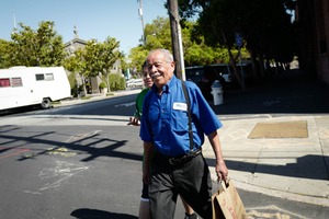 A cheerful elderly man strolls through a sunlit street, clutching a brown paper bag, embodying a sense of contentment and nostalgia. He wears a bright blue shirt that contrasts beautifully with the vibrant greenery surrounding him. The casual composition captures a moment of warmth and connection, enhanced by the soft shadows cast by the midday sun.
