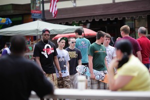 A group of casually dressed adolescents strolls through a vibrant outdoor setting, radiating a mix of curiosity and camaraderie. The composition captures their movement amidst the bustling backdrop of vendors and viewers, conveying a lively, youthful atmosphere. Soft, diffused lighting enhances the candid moment, creating an inviting and informal mood.