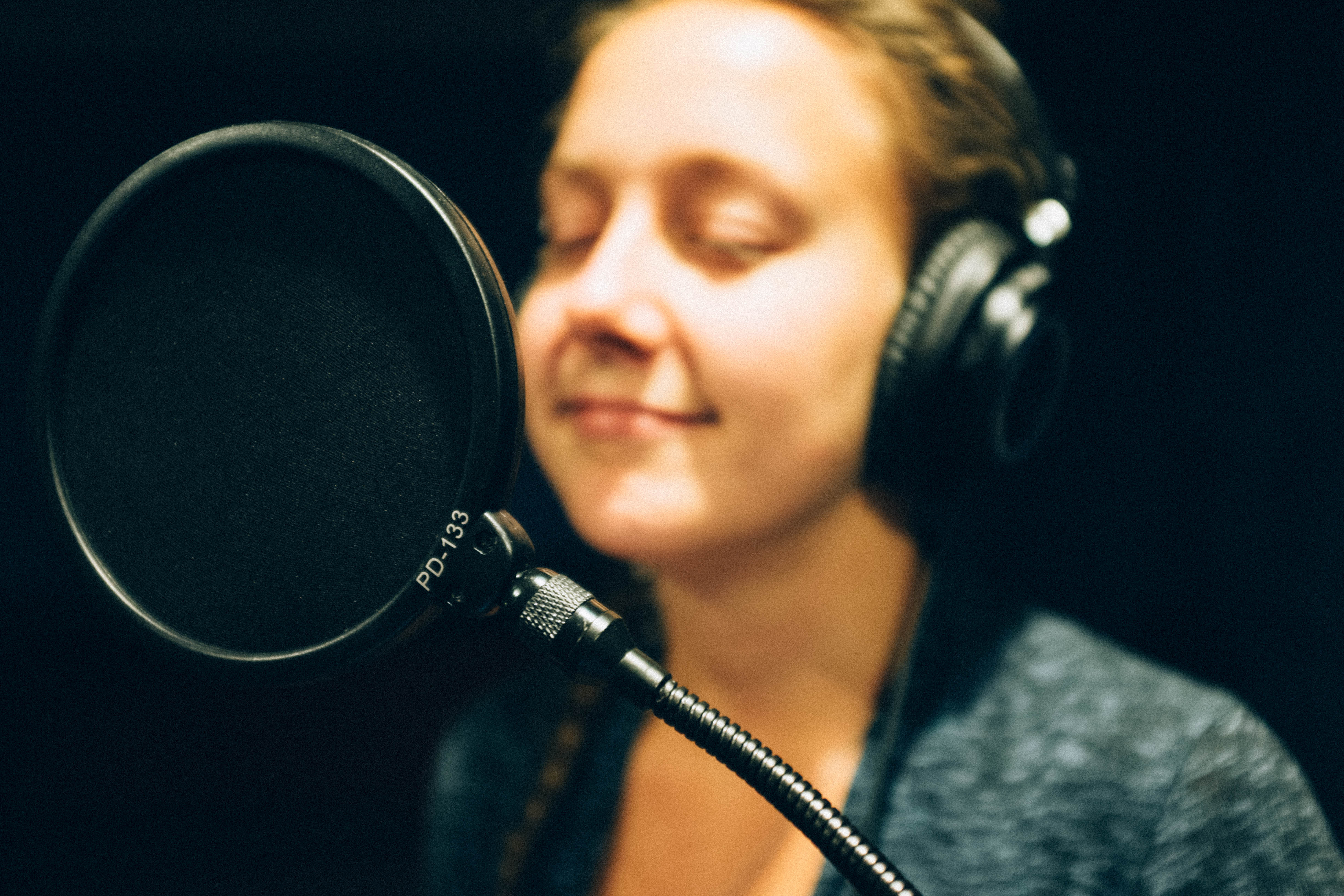 In this intimate portrait, a woman closes her eyes, seemingly lost in the moment as she engages with the microphone in front of her. The soft, warm lighting highlights her serene expression, suggesting a sense of focus and tranquility amidst the recording process. The blurred microphone creates a sense of depth, inviting the viewer to connect with her emotive experience.
