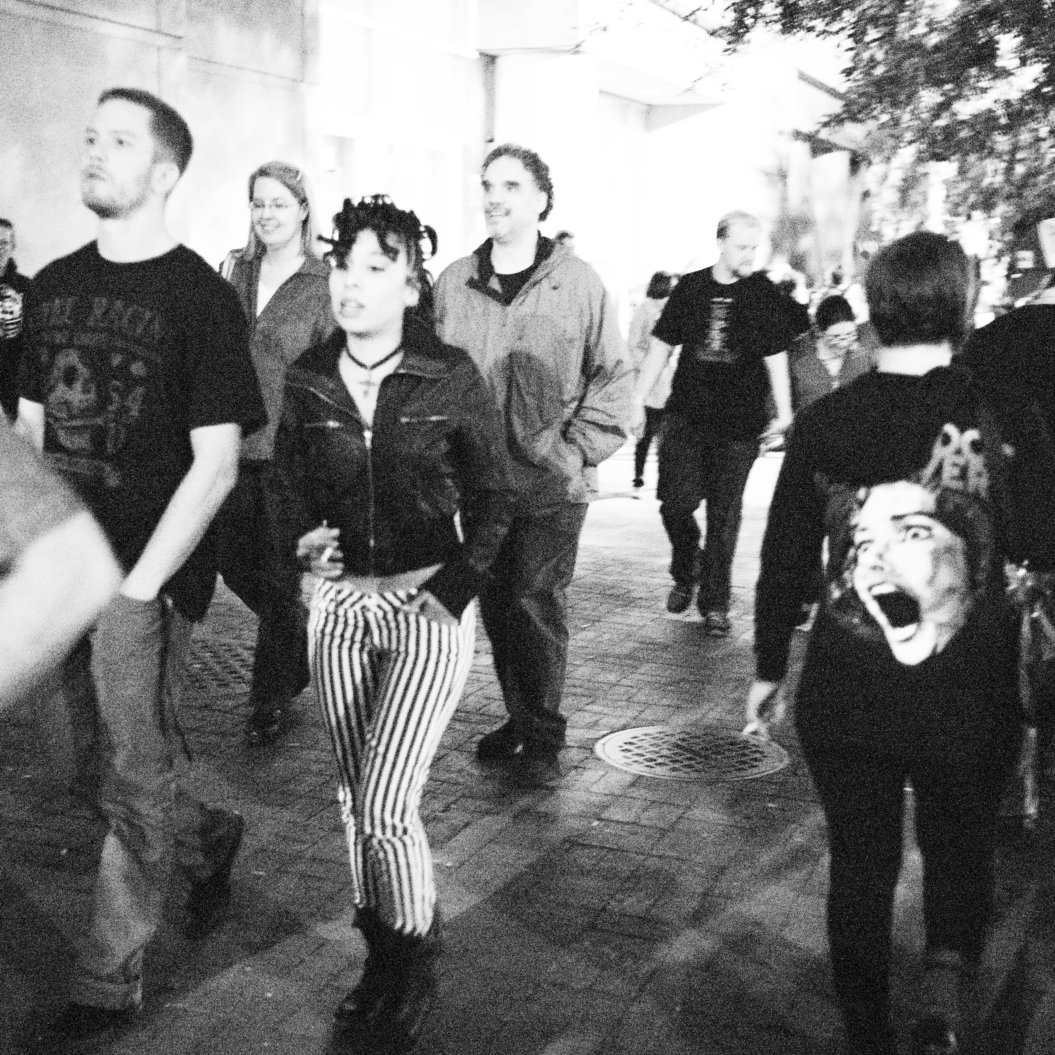 A group of individuals strolls down a dimly-lit street, their varied fashion choices expressing a vibrant mix of personalities. The striking contrast between the bright stripes of one woman's pants and the darker attire of her companions adds to the dynamic atmosphere. The black-and-white composition enhances the mood, creating a sense of nostalgia and urban intrigue.