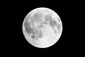 The photograph captures a stunning full moon against a deep black sky, emphasizing its texture and craters with striking clarity. The stark contrast between the moon's brilliant white surface and the darkness surrounding it creates a serene and almost ethereal mood. This composition invites contemplation, evoking feelings of wonder and tranquility as the viewer gazes into the vastness of the night.