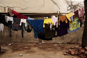 The photograph captures a vibrant array of clothes hanging on a clothesline, each piece telling a story of daily life. Bathed in soft, natural light, the scene evokes a sense of nostalgia and simplicity, contrasting the stark stone background. The varied colors and textures create a whimsical display, celebrating the ordinary moments that adorn our lives.