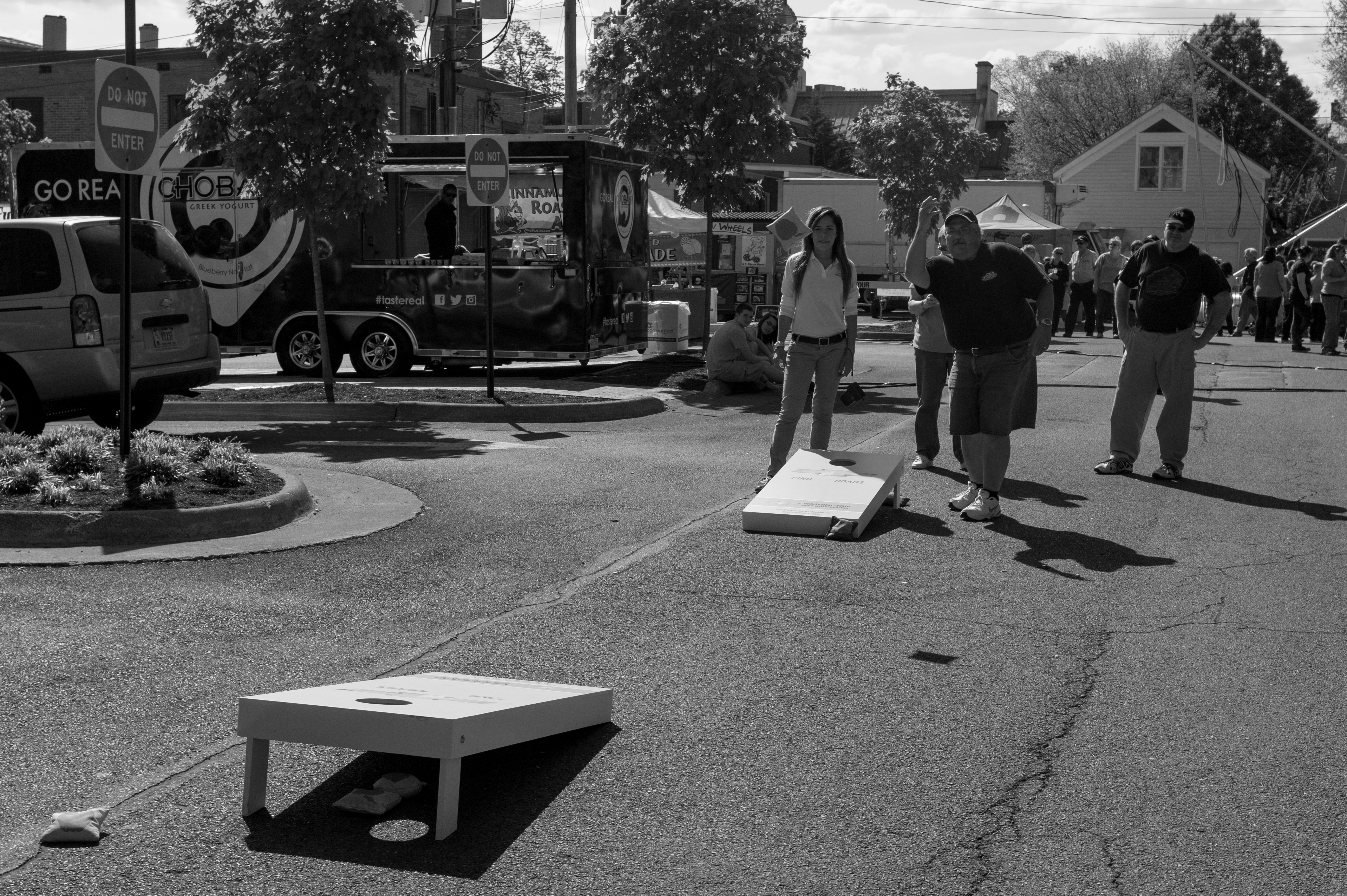 In this lively street scene, participants engage in a spirited game of cornhole, epitomizing community entertainment. The black-and-white tones lend a nostalgic feel, contrasting sharply with the bustling event backdrop filled with food trucks and onlookers. The composition captures a moment of focus and determination from the players, while the inviting atmosphere is emphasized by soft shadows and scattered foliage.