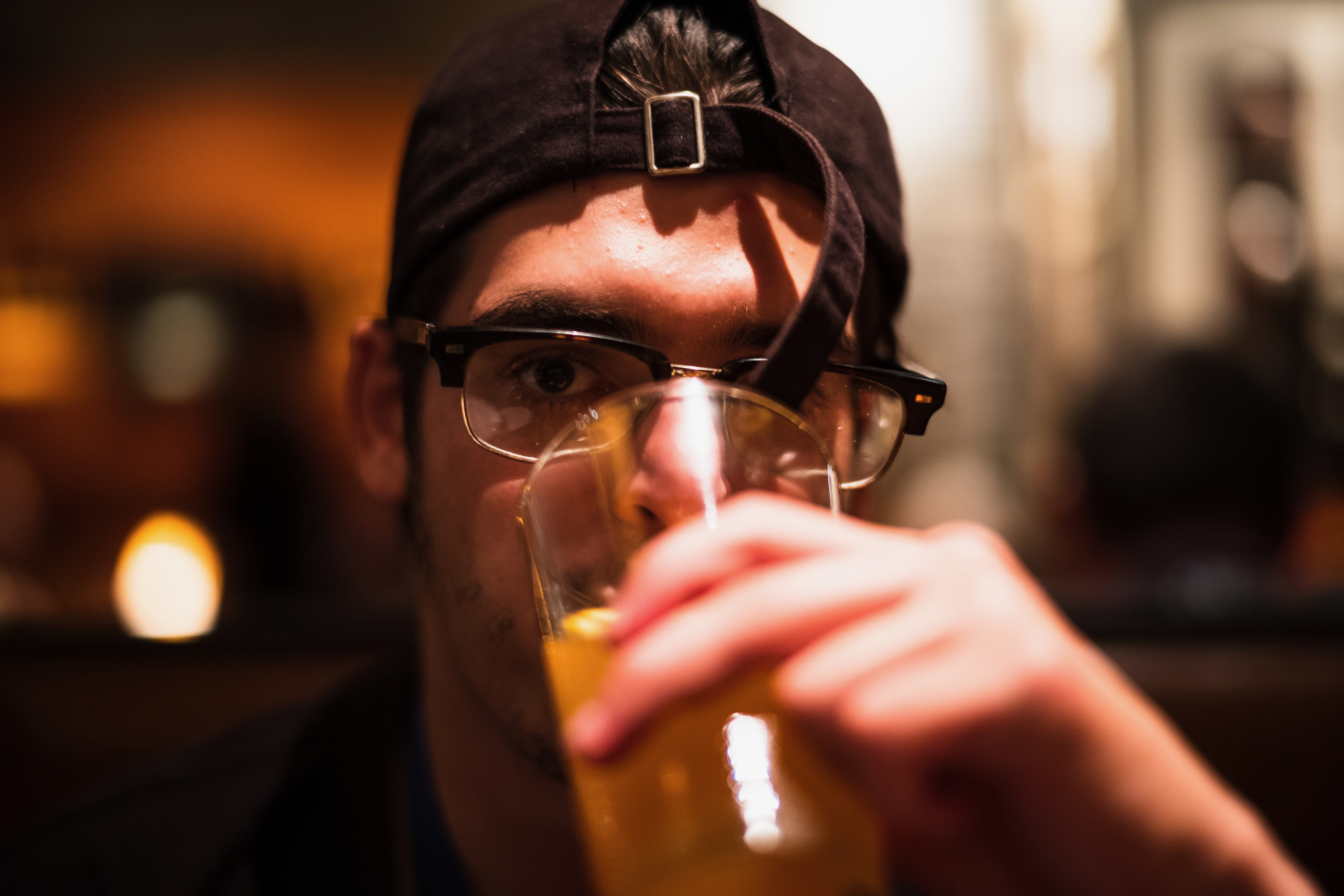 The photograph captures a young man partially obscured by a glass, taking a sip of his drink, his gaze piercing yet introspective. Warm ambient lighting bathes the scene, enhancing the sense of a relaxed, social atmosphere while casting soft shadows on his face. The composition balances his focus on the drink with the allure of the blurred background, inviting viewers into a moment of quiet contemplation.