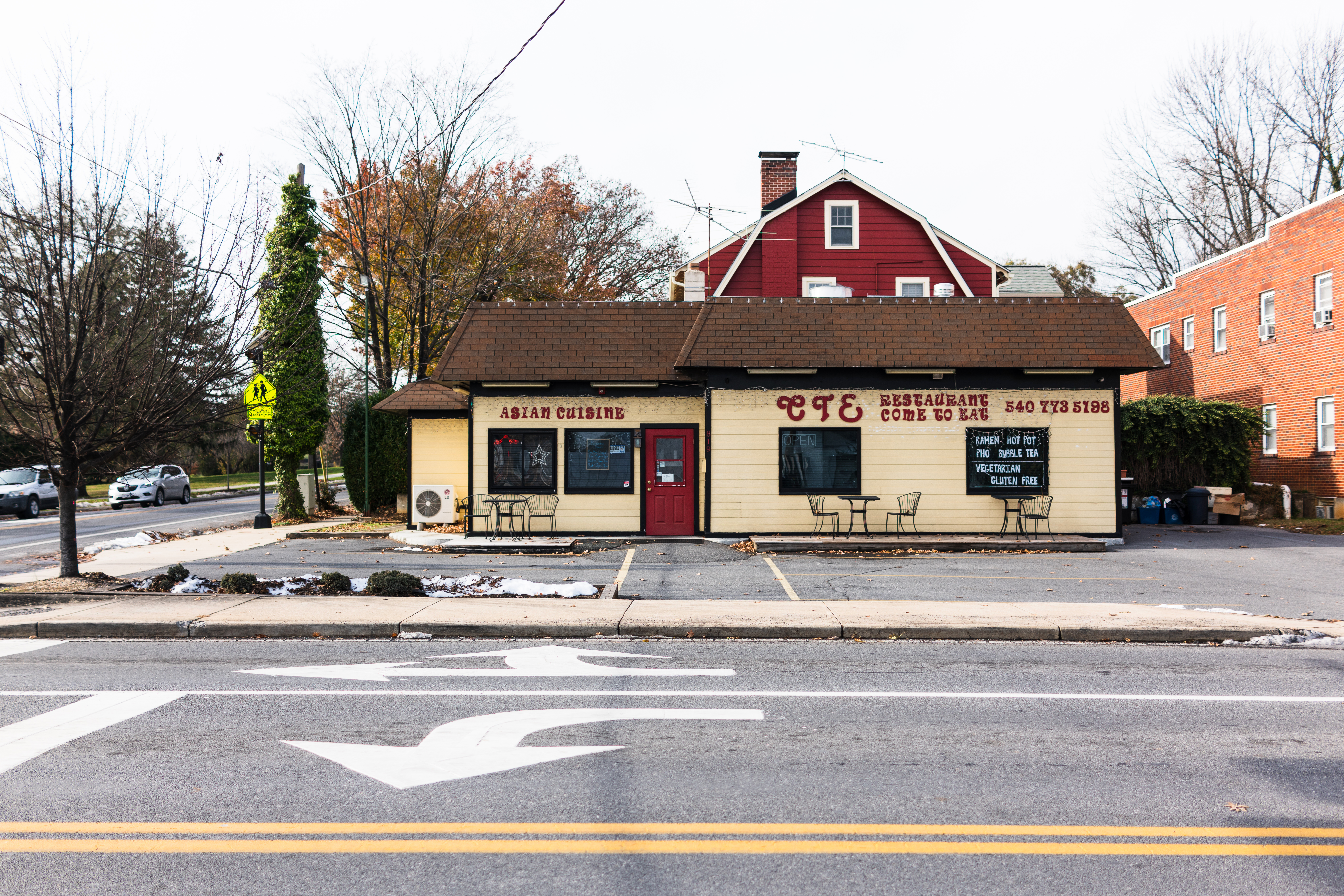 The photograph captures a charming, quiet Asian cuisine restaurant, framed by bare trees and a muted autumn landscape. The composition highlights the inviting facade, displaying warm colors contrasted against the cool tones of the street, creating a nostalgic atmosphere. Soft, natural light enhances the serene mood, evoking a sense of comfort and community.