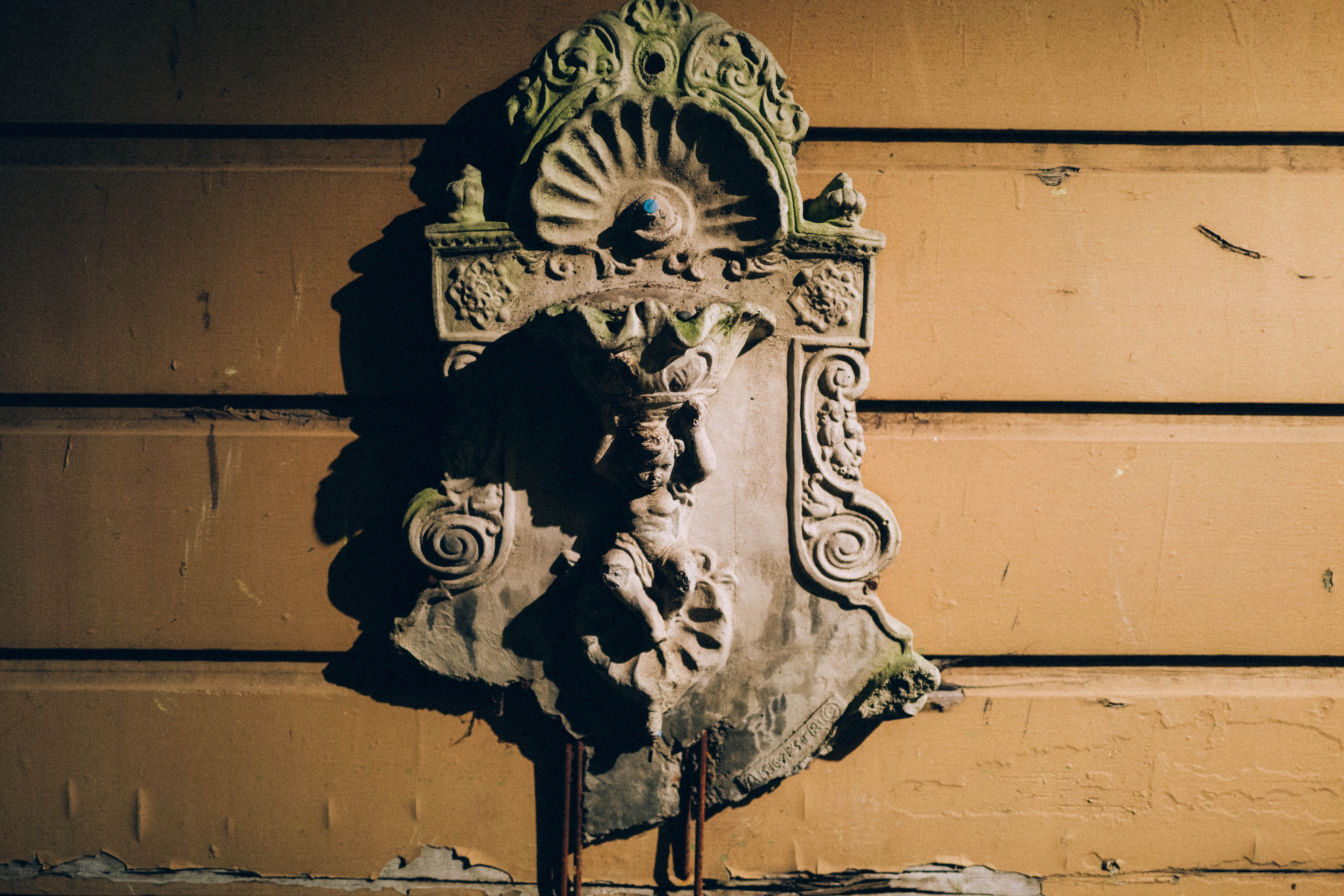 This photograph captures an ornate wall fixture, showcasing intricate carvings that hint at a bygone era. The warm, dim lighting highlights the texture and wear on the surface, evoking a sense of nostalgia and mystery. Set against a muted, peeling wall, the piece stands out as a remnant of history, inviting curiosity about its story.
