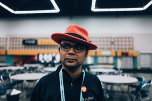 A man stands poised in the foreground, his striking red hat contrasting against the muted tones of an empty hall filled with circular tables. The lighting is soft yet defined, creating a reflective mood as he gazes thoughtfully off-camera. The background hints at an event space, capturing a moment of individuality amid an expansive setting.