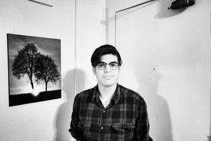The photograph captures a young man standing in a softly lit room, exuding a sense of quiet introspection. Against a backdrop of a black-and-white tree silhouette, the interplay of light and shadow creates a moody atmosphere, emphasizing the subject's pensive expression and the depth of his plaid shirt. The composition is intimate, inviting viewers into a personal moment of reflection.