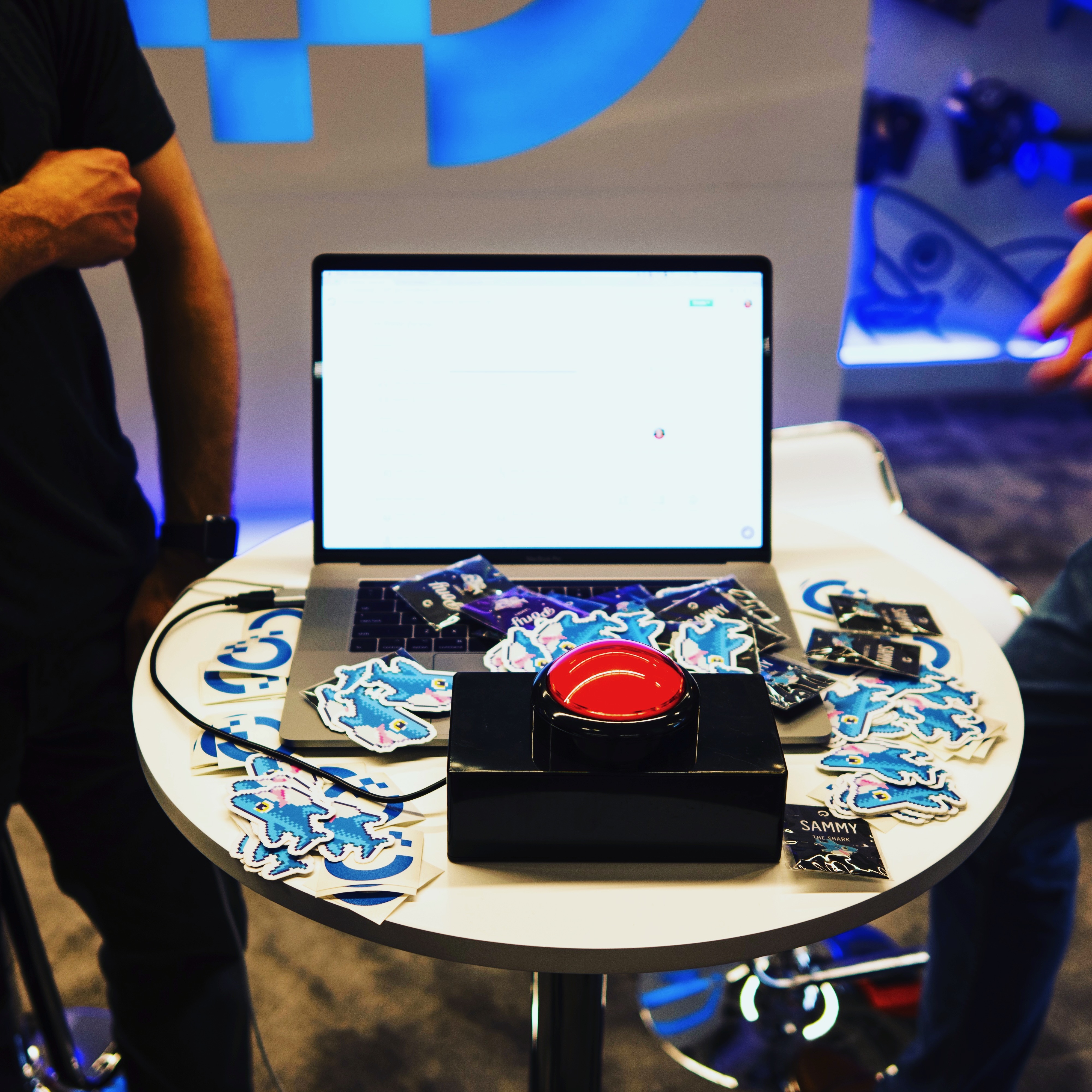 The photograph captures a lively booth display featuring a large red button, surrounded by colorful stickers and a laptop. The setting exudes a playful and engaging atmosphere, enhanced by soft, ambient lighting that creates a warm and inviting mood. The blurred figures in the background add a dynamic element, suggesting interaction among participants at an event or exhibition.