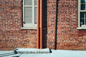 This photograph captures a detailed view of a weathered brick wall, highlighted by two prominent orange pipes that diverge upward. Soft sunlight casts gentle shadows, enhancing the textures of the bricks and the muted tones of the shuttered window beside them. The composition balances industrial elements with the organic warmth of the brick, evoking a sense of quiet urban life.