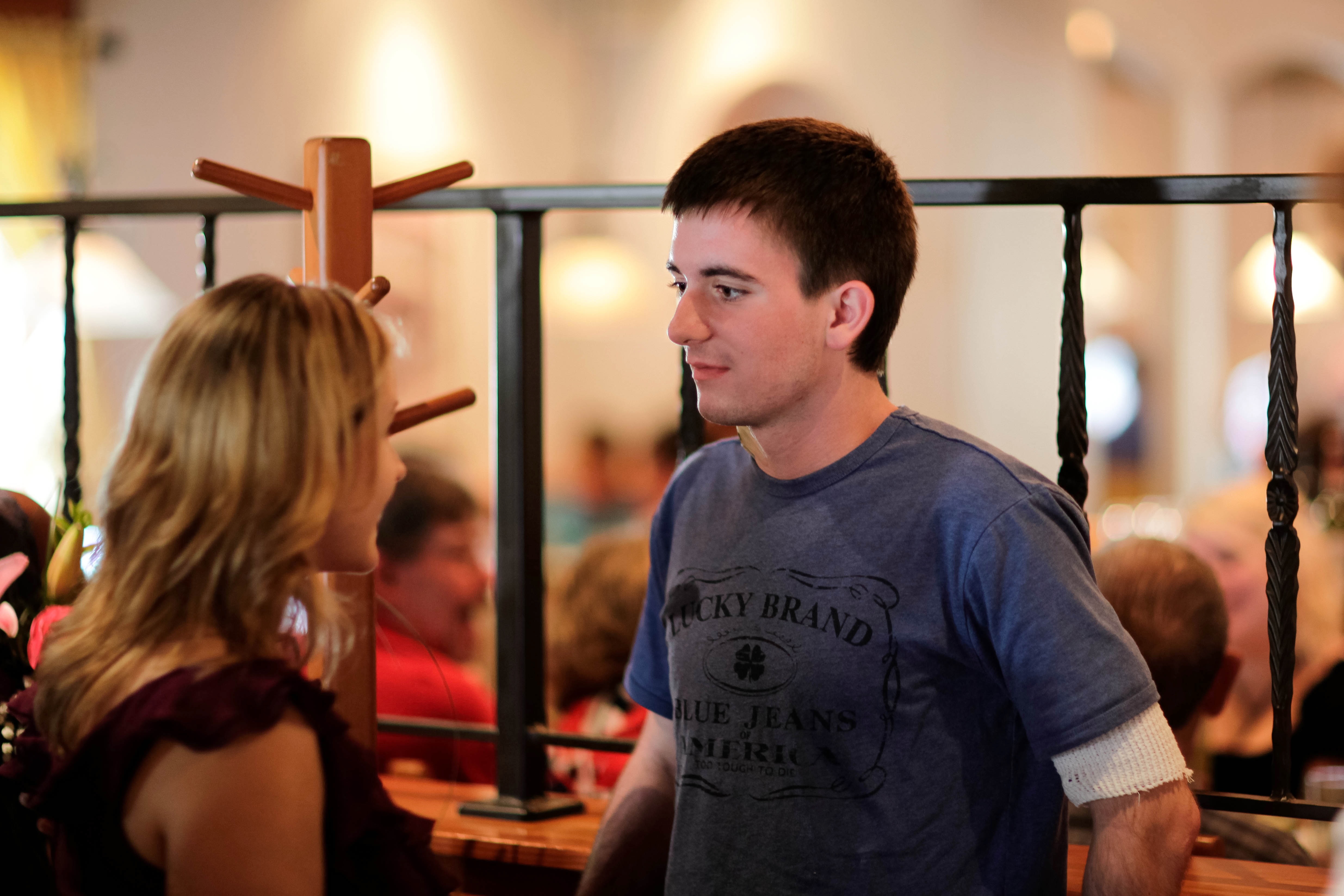 In a warmly lit restaurant, a young man engages in a conversation with a woman nearby, their expressions revealing curiosity and connection. The intimate setting is enhanced by the soft bokeh of the background, suggesting a lively atmosphere without detracting from their interaction. The interplay of light and shadow creates a cozy yet vibrant mood.