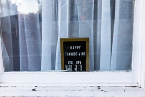 The photograph captures a window draped with sheer white curtains, softly filtering natural light. At the center, a sign reads 'HAPPY THANKSGIVING,' conveying warmth and celebration, contrasted by its simple black and gold frame. The inviting atmosphere evokes feelings of togetherness and gratitude, typical of the holiday season.