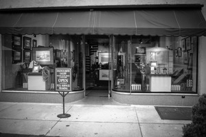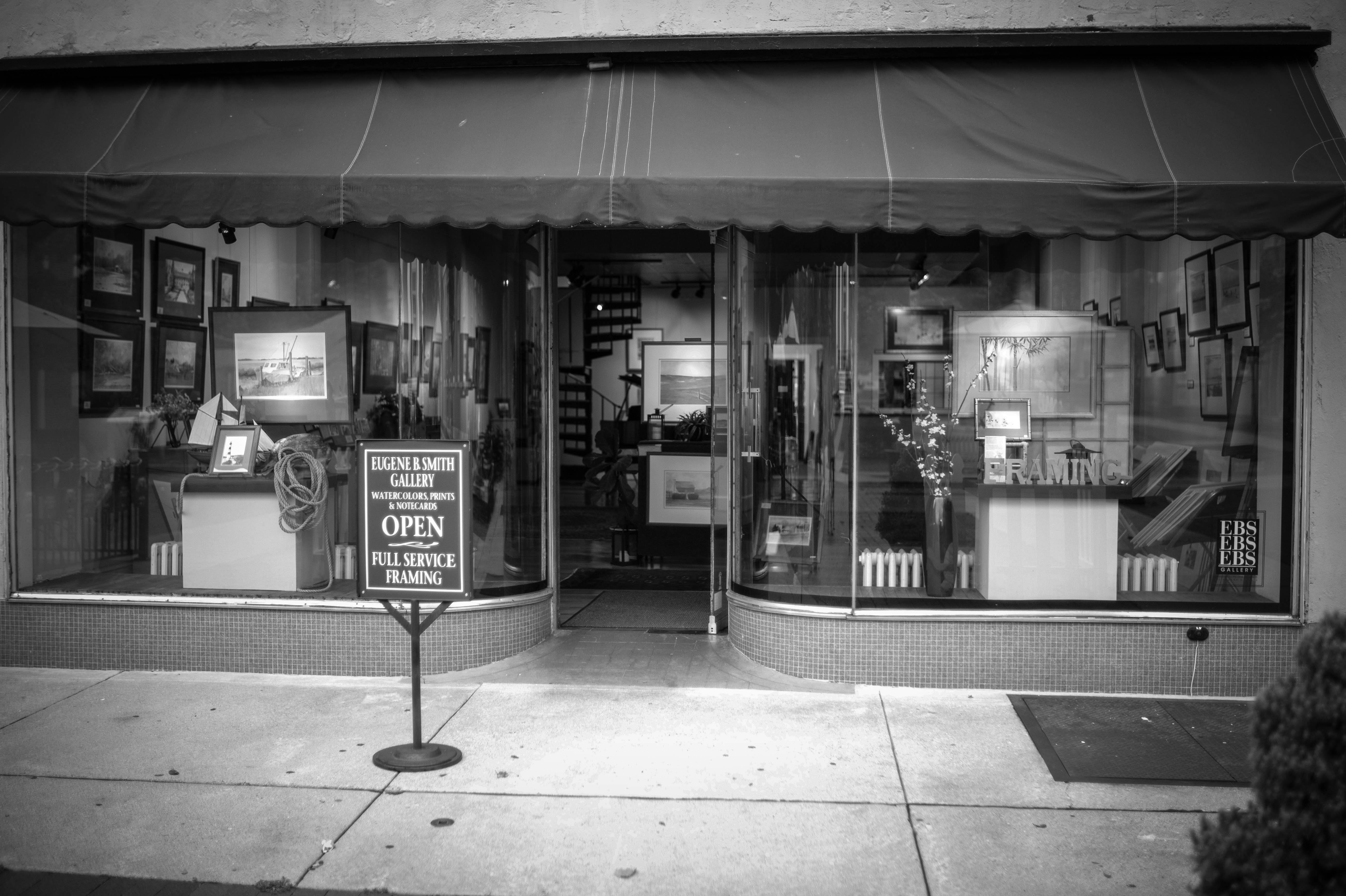 The photograph captures the inviting facade of an art gallery, adorned with a bold 'OPEN' sign that draws the viewer in. Soft black-and-white tones create a nostalgic atmosphere, highlighting the elegant display of framed artworks within. The composition is balanced, with the storefront's geometric lines contrasting against the organic forms of the plants outside.