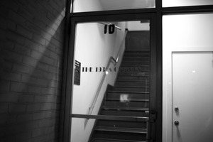 The photograph captures the entrance to 'The 1930's Offices,' framed by a stark glass door and a dim stairway leading upward. The black and white tones evoke a sense of mystery and nostalgia, emphasizing the passage of time. Shadows dance across the textured wall, enhancing the contemplative mood of the scene as the viewer is left to ponder what lies beyond the door.