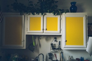 This photograph captures a cozy kitchen space, dominated by cheerful yellow cabinet doors that evoke a sense of warmth and nostalgia. The soft, diffused lighting creates a serene atmosphere, accentuated by the lush greenery creeping above the cabinets. The composition invites the viewer to engage with the everyday charm of home life, balancing color and simplicity.