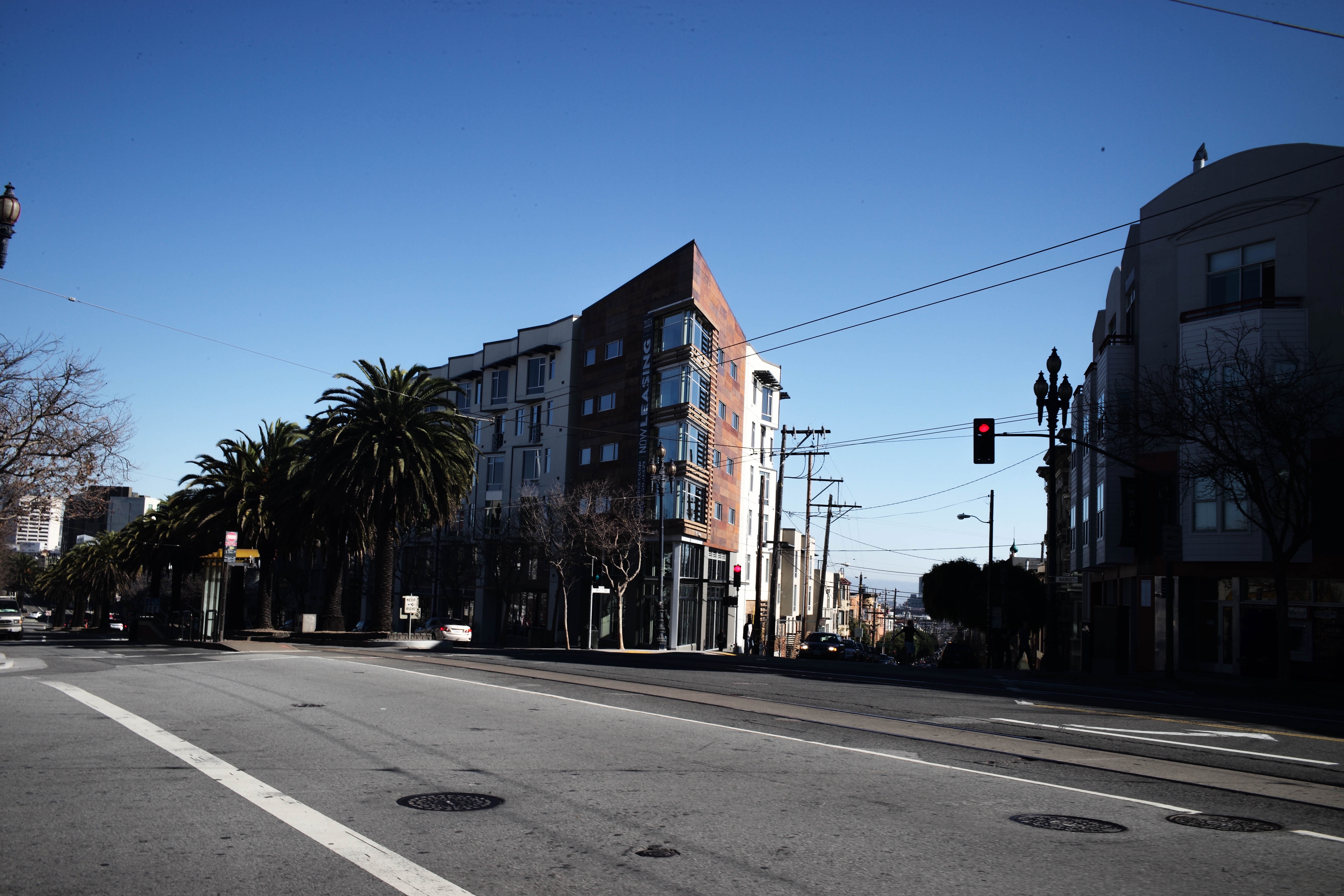 This photograph captures a quiet city street, flanked by palm trees and modern architecture under a vivid blue sky. The stark lighting enhances the geometric lines of the buildings, creating a sense of calm and stillness in the urban landscape. A solitary red traffic light stands as a lone sentinel, hinting at the life that's absent from this moment in time.
