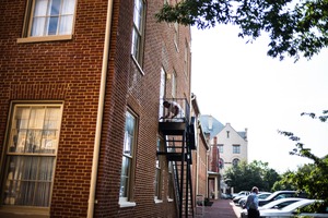 The photograph captures a moment of quiet labor as a person works on a fire escape, adding an element of human life to the stately brick building. The warm, golden lighting accentuates the textures of the red brick while casting gentle shadows across the scene, creating a nostalgic and contemplative mood. In the foreground, a solitary figure strolls by, reinforcing a sense of urban solitude amidst the architectural backdrop.