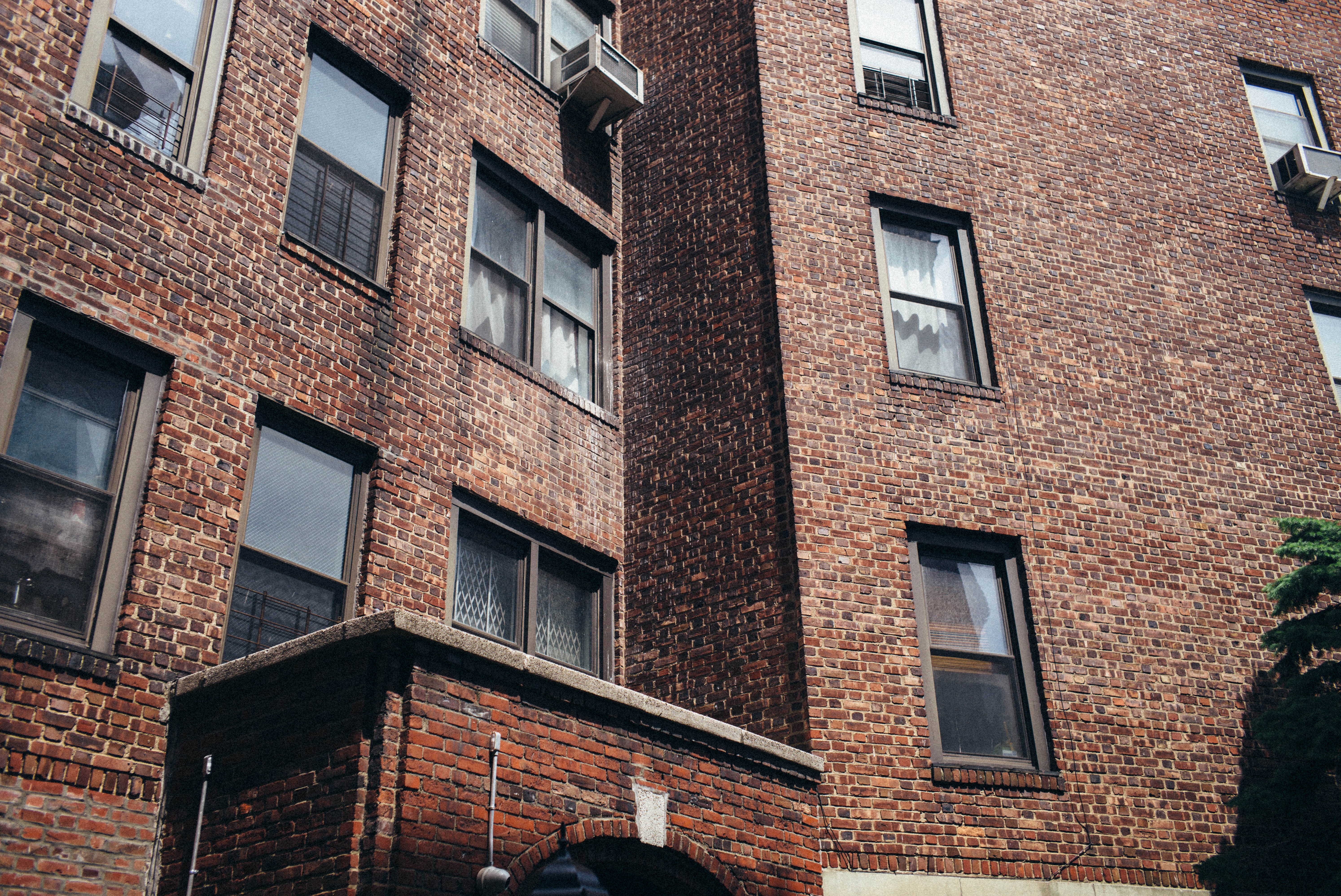 A low-angle view of a weathered brick building, showcasing its textured facade and a series of tall, narrow windows. The ambient sunlight casts a soft glow, highlighting the rich reds and browns of the bricks, evoking a sense of nostalgia and urban resilience. An air conditioning unit peeks out from one window, adding a contemporary touch to the classic architecture.