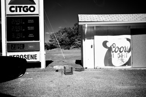This black-and-white photograph captures a vintage gas station that feels both nostalgic and desolate. The stark contrast highlights the rundown signage and the painted Coors Light logo, evoking a sense of faded glory. The composition is framed tightly, focusing on the gas prices and the building, creating an introspective mood of simplicity and solitude.