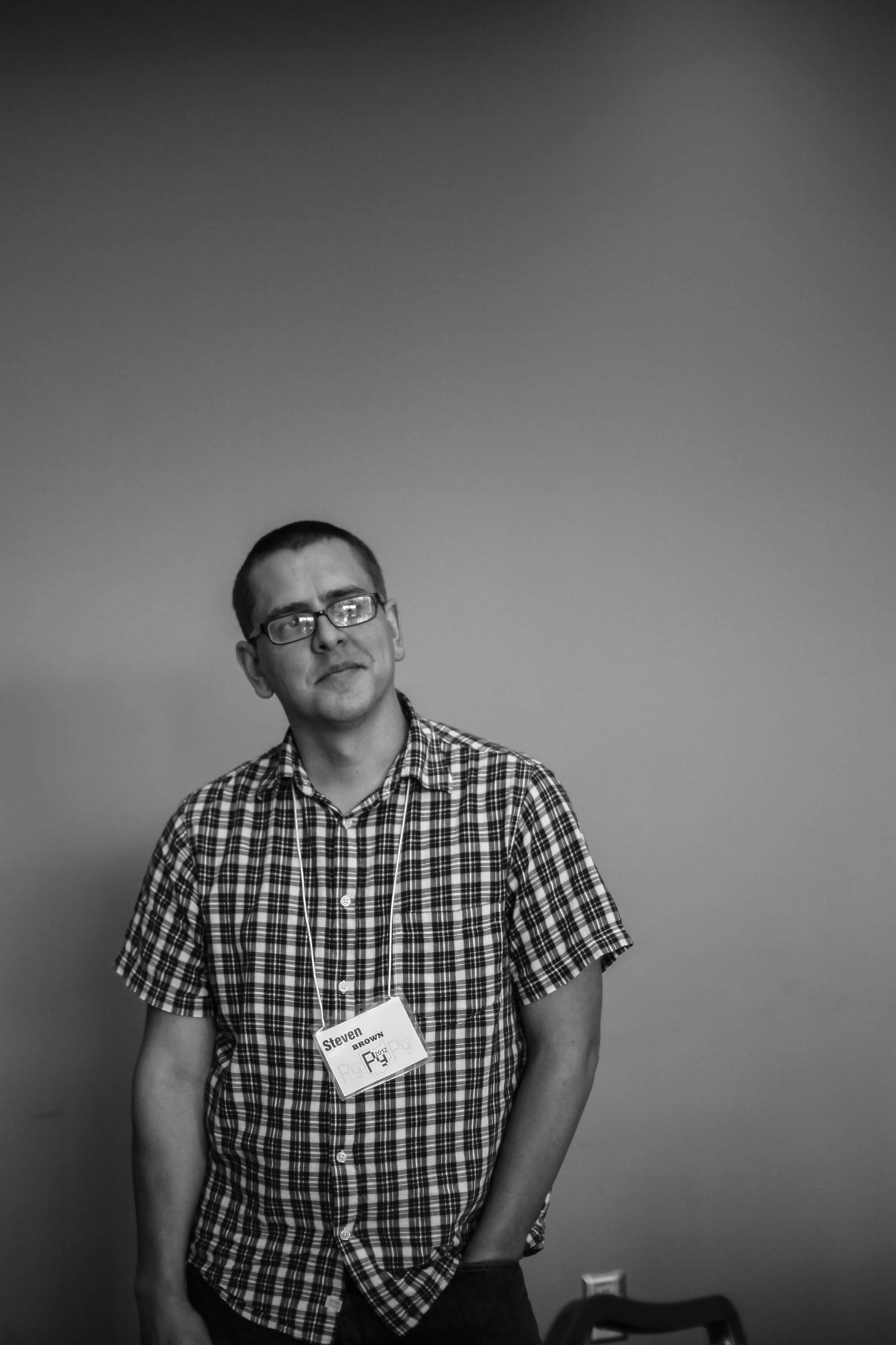 This black-and-white photograph captures a man deep in thought, standing against a subdued background. The soft lighting accentuates his thoughtful expression, while the checkered shirt adds a layer of casual familiarity. The overall mood evokes introspection and quietude, inviting viewers to ponder his thoughts.
