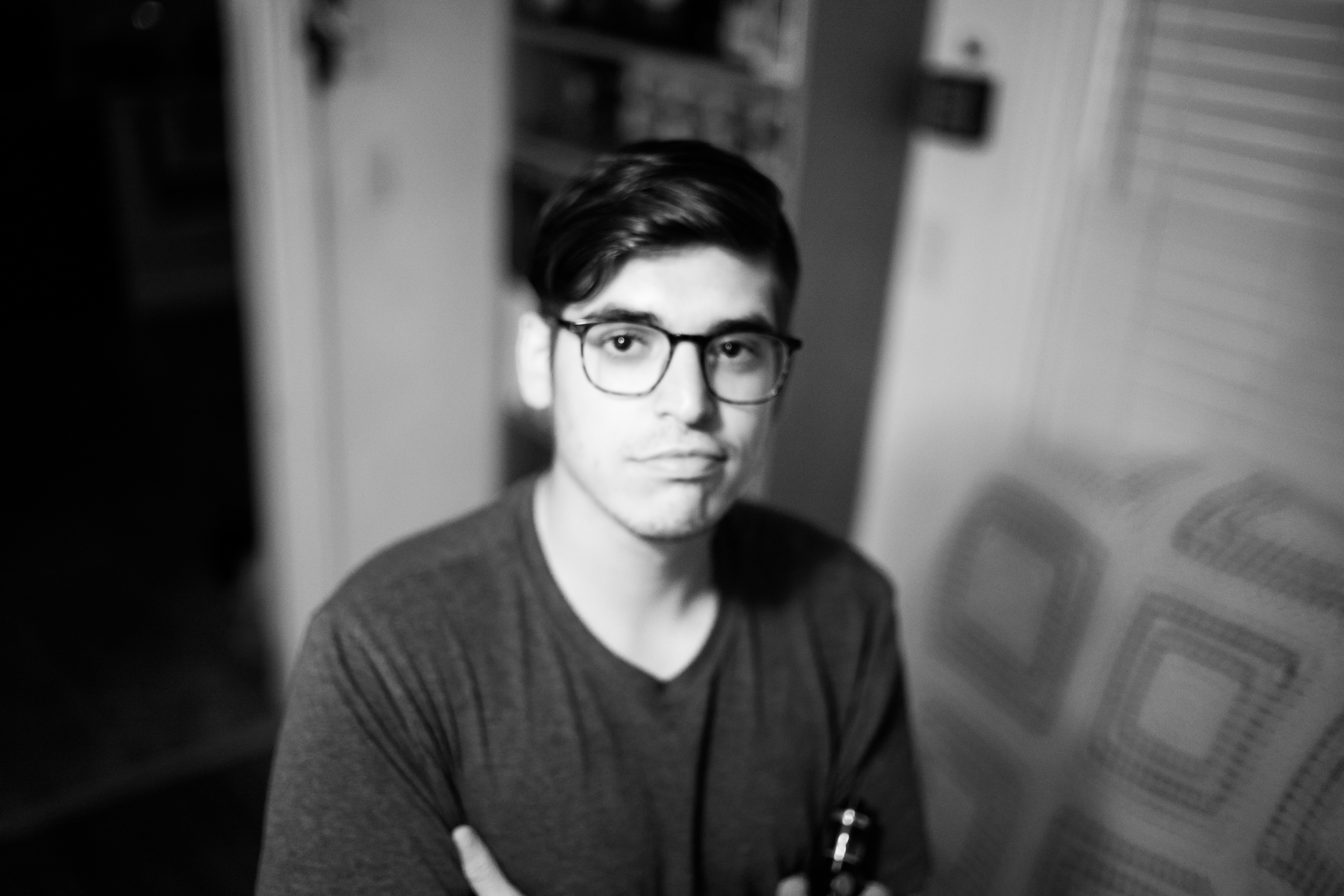 In this black-and-white portrait, a young man sits with a pensive expression, gazing directly at the camera. The surrounding darkness adds an air of introspection, while soft focus on the background draws attention to his thoughtful demeanor. The chiaroscuro lighting creates a subtle contrast, enhancing the mood of contemplation and depth.