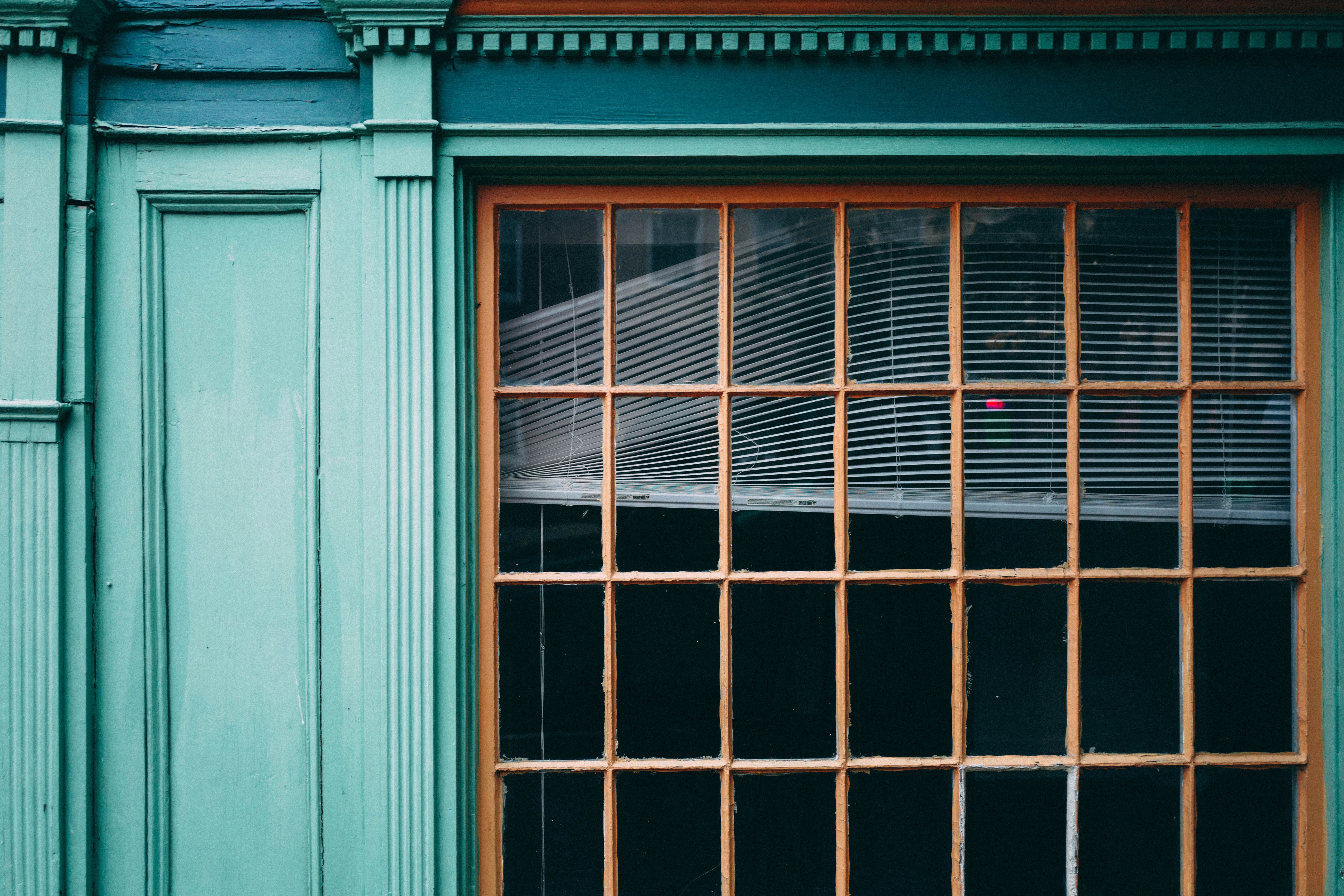 This photograph captures a beautifully detailed window framed by a vibrant teal wall, evoking a sense of nostalgia. The soft natural light filtering through the window adds an intimate mood, highlighting the contrasting textures of the aged wooden panes. Subtle reflections and the hint of blinds create a layered composition that invites contemplation of the space beyond.