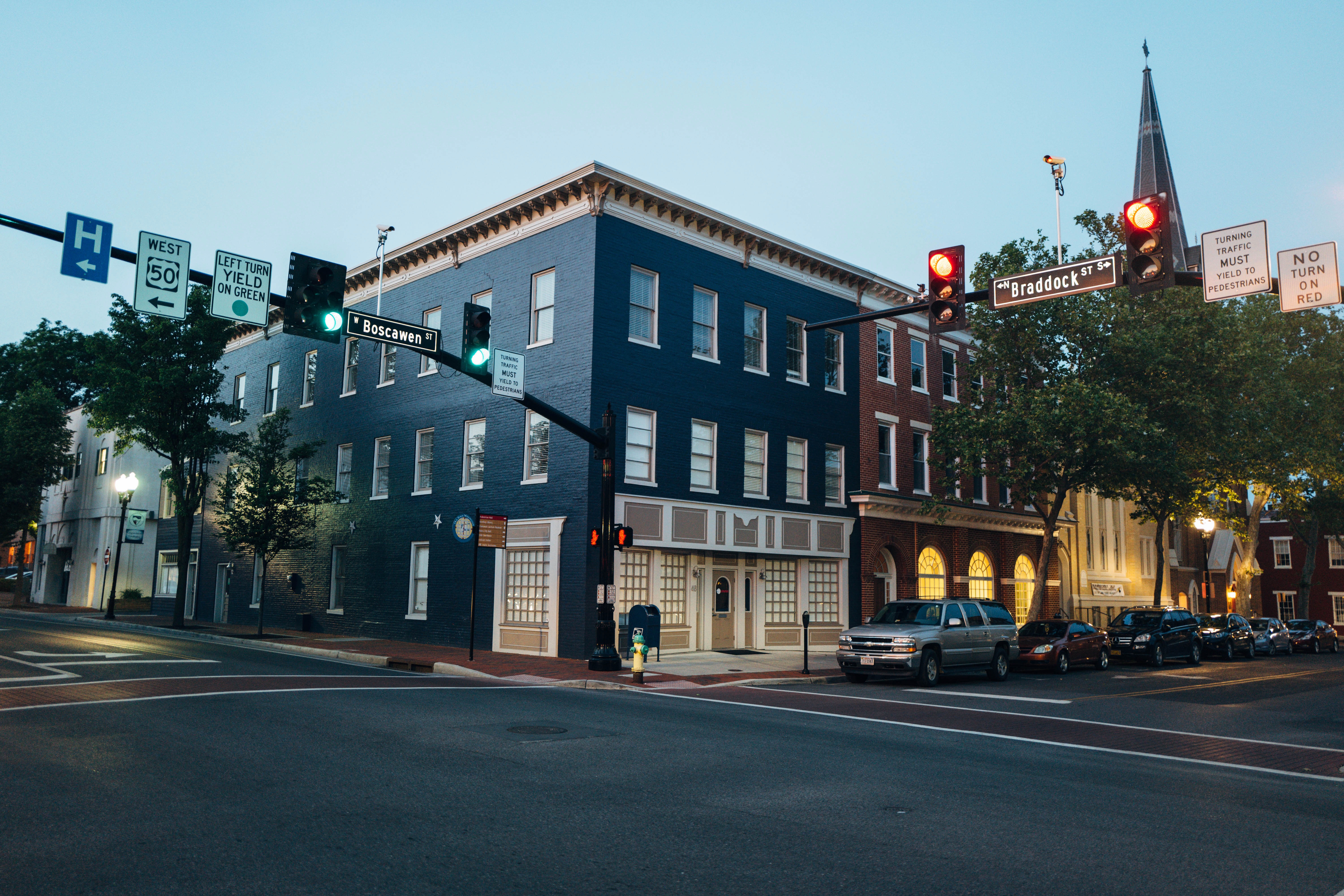 This photograph captures a serene urban intersection at twilight, where the deep blue facade of the corner building stands out against the fading light. Street lights glow softly, illuminating the scene while casting gentle reflections on the rain-glazed pavement. The composition invites a sense of calm in the middle of the city, highlighting the stillness of early evening life.