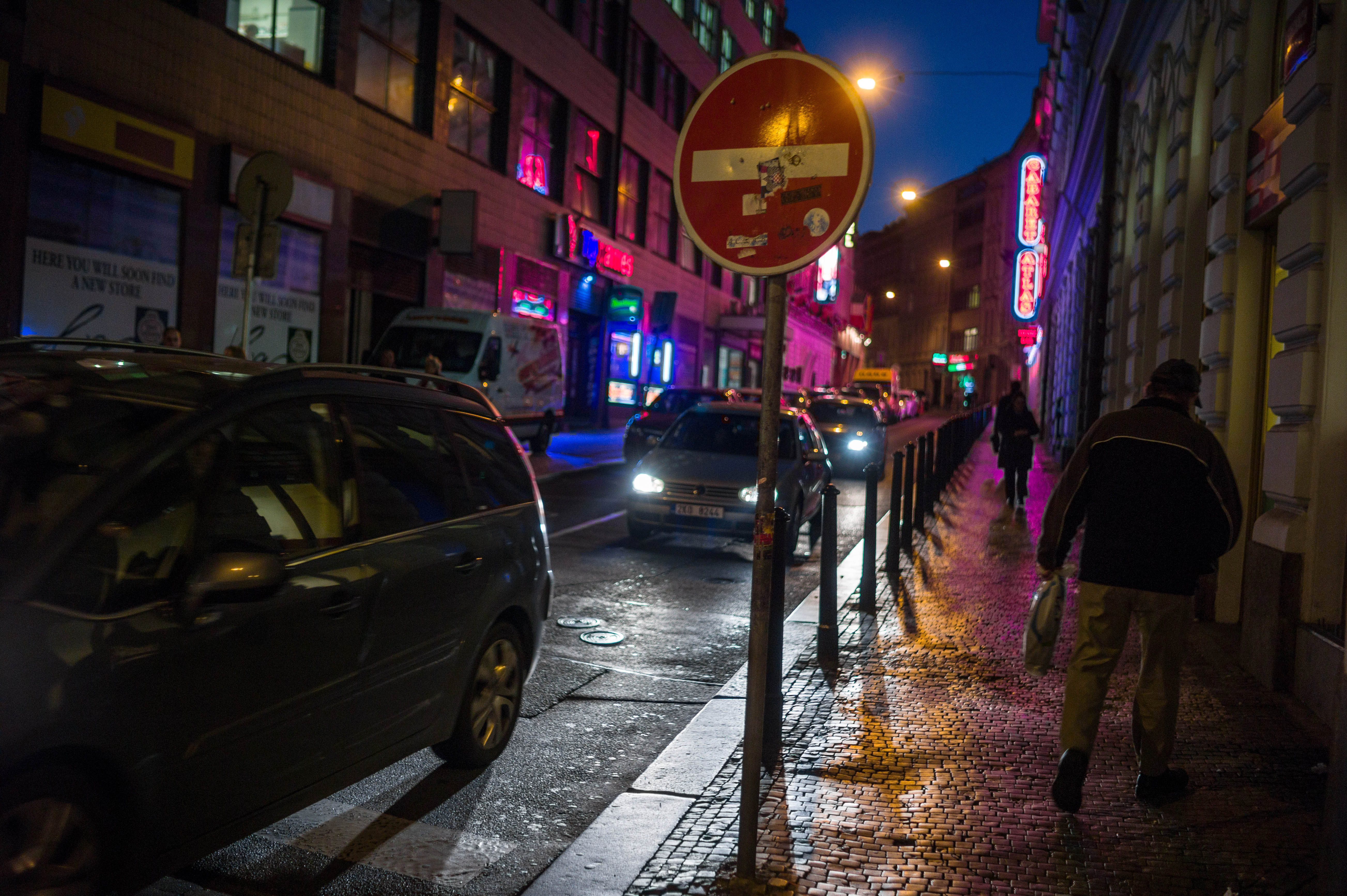 A solitary figure walks along a dimly lit street, embodying a sense of introspection amid the vibrant glow of neon signs. Cars illuminate the wet pavement, creating a stark contrast with the murky twilight. The composition invites the viewer to ponder the interplay between urban life and solitude.