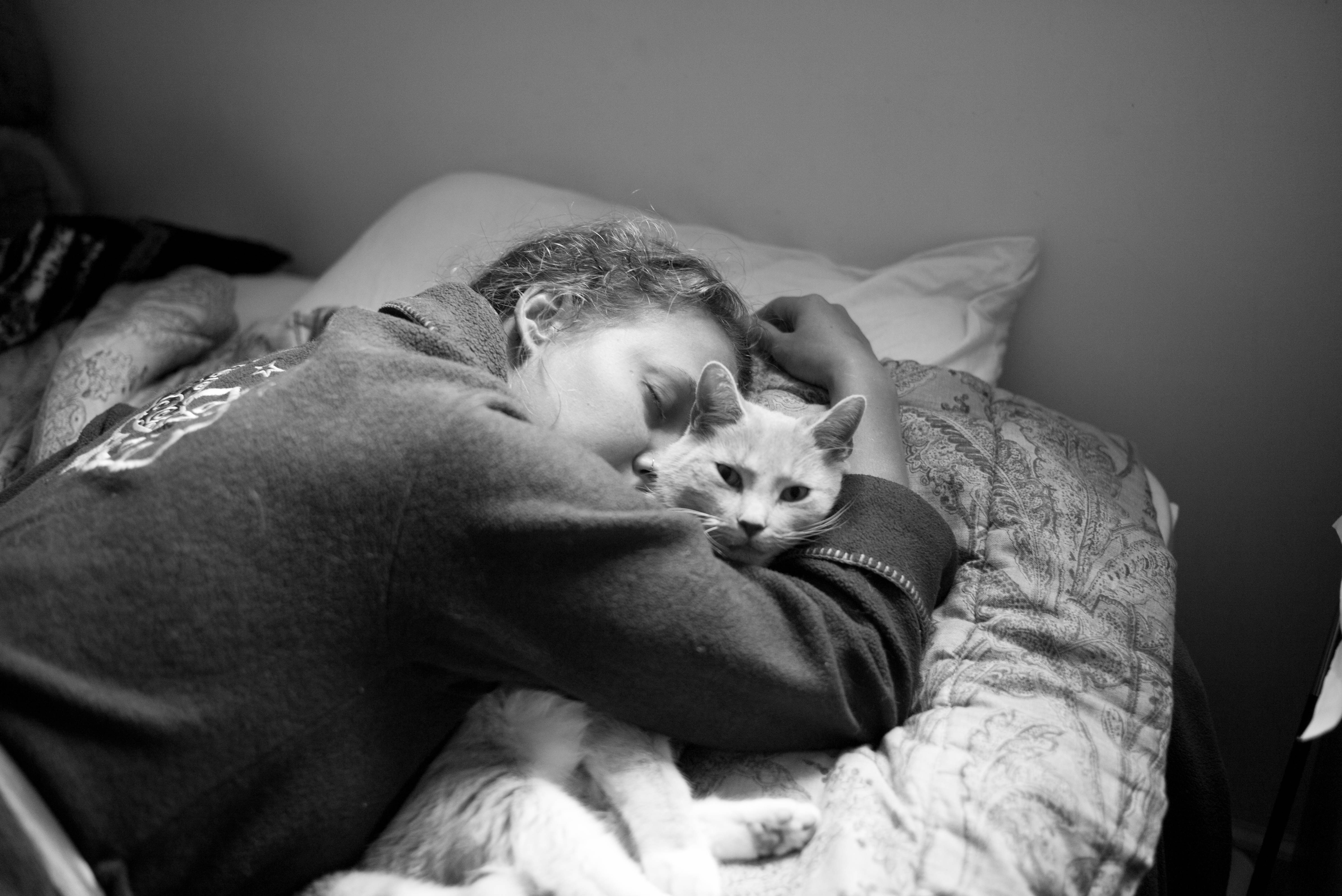 In this intimate black-and-white photograph, a young person peacefully dozes against a cozy bedspread, cradling a sleeping cat. The soft lighting casts gentle shadows, enhancing the serene mood of companionship and tenderness. The composition captures a moment of pure tranquility, where the bond between human and pet is beautifully illustrated in a simple, yet profound way.
